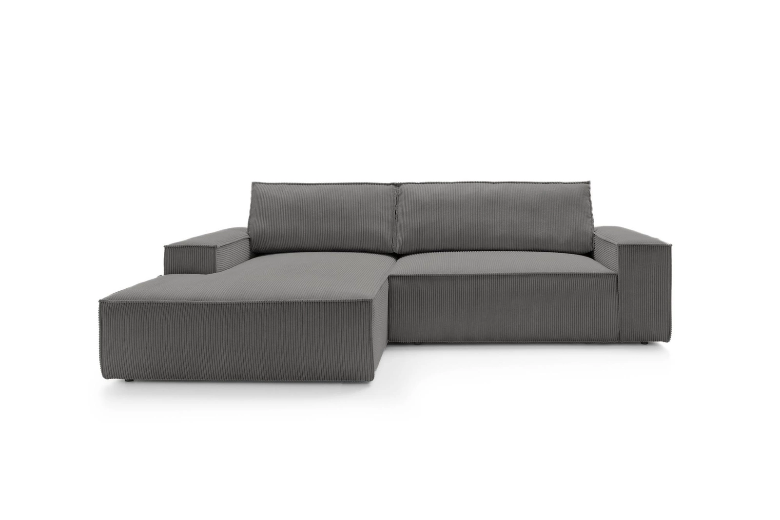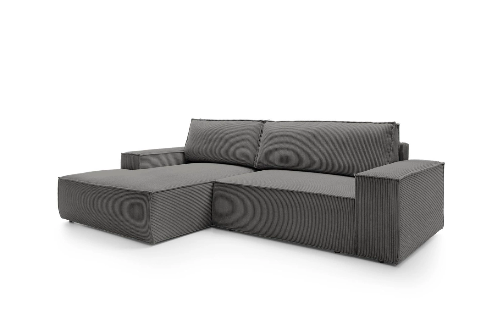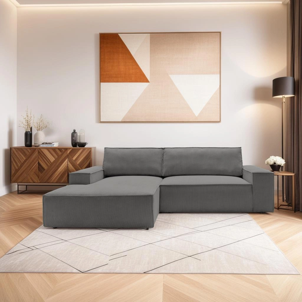 Narożnik sztruksowy Molde M lewy marki Intesi to nowoczesny mebel wypoczynkowy do salonu, wykonany z przyjemnej w dotyku sztruksowej tkaniny w odcieniu ciemnoszarego. Model ten łączy komfort codziennego relaksu z praktyczną funkcją spania o powierzchni 210x135 cm oraz pojemnikiem na pościel. Dzięki proporcjom 267 cm szerokości i nowoczesnej, prostej linii, narożnik idealnie dopasuje się zarówno do średnich, jak i większych przestrzeni dziennych.