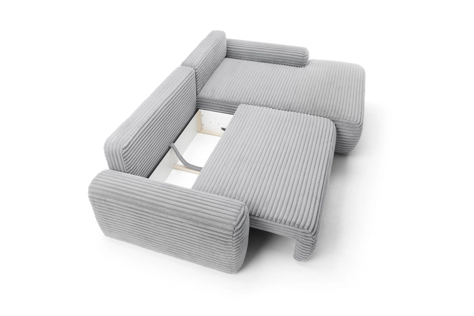 Funkcjonalność narożnika podkreśla praktyczny pojemnik na pościel, który pomieści koce, poduszki lub inne tekstylia niezbędne podczas codziennego użytkowania. To rozwiązanie docenią zarówno osoby ceniące porządek, jak i te, które potrzebują dodatkowej przestrzeni do przechowywania w salonie.