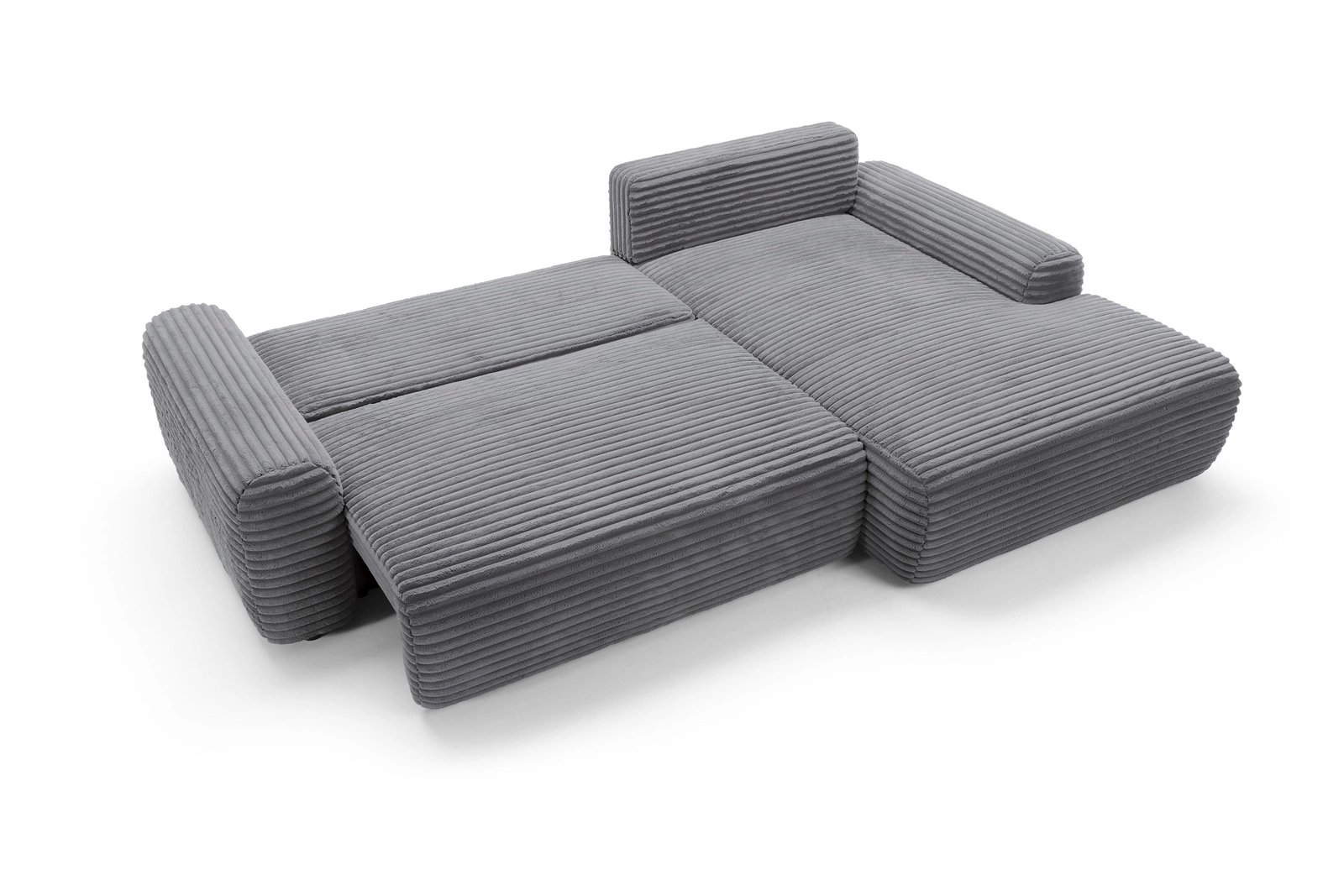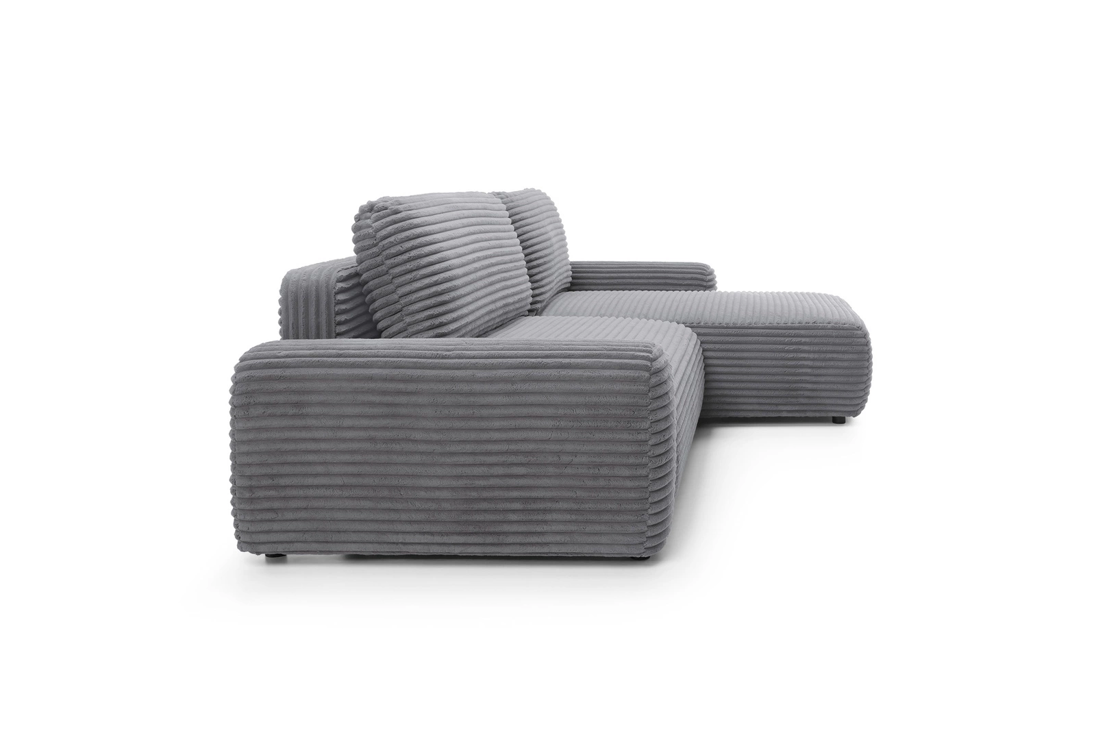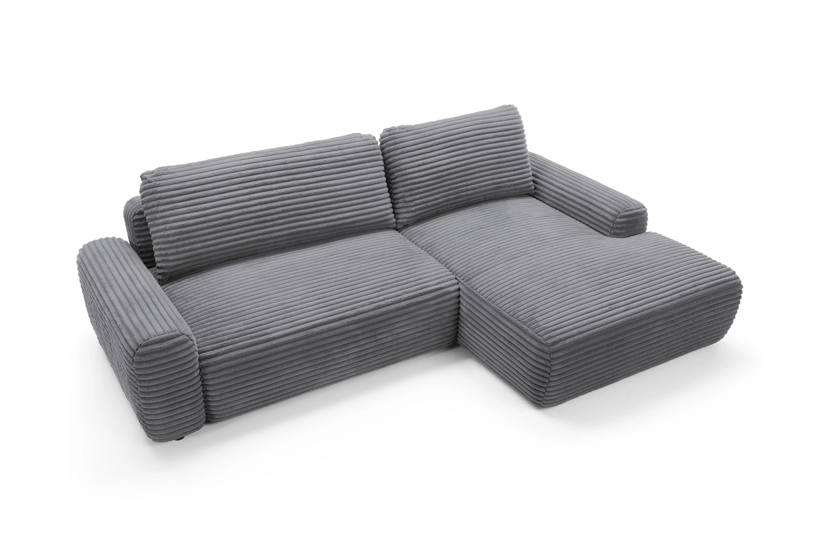 Narożnik sztruksowy z funkcją spania Domle prawy szary marki Intesi to nowoczesny mebel tapicerowany, który łączy minimalistyczny design z wysoką funkcjonalnością. Wykonany z miękkiej tkaniny sztruksowej w eleganckim, ciemnoszarym kolorze, oferuje dużą powierzchnię wypoczynkową (280×150 cm) oraz wygodne miejsce do codziennego spania o wymiarach 210×135 cm. Praktyczny pojemnik na pościel oraz komfortowe siedzisko z pianki sprawiają, że narożnik doskonale sprawdzi się w salonie jako centrum rodzinnego relaksu i spotkań.