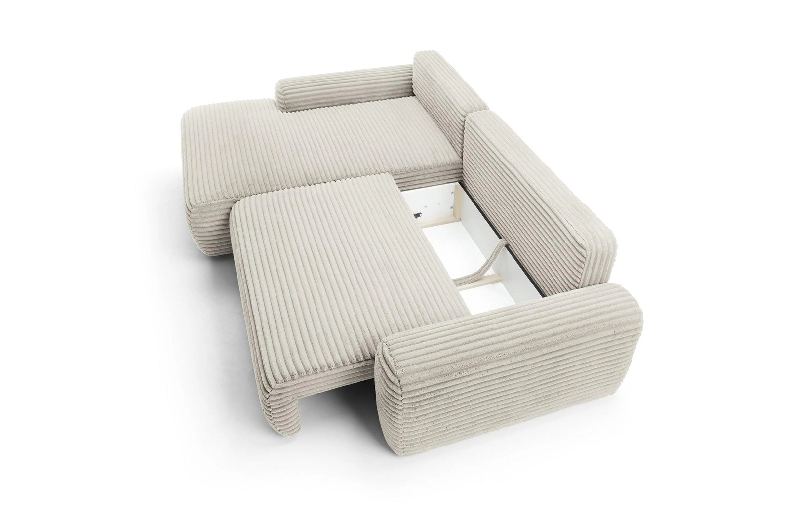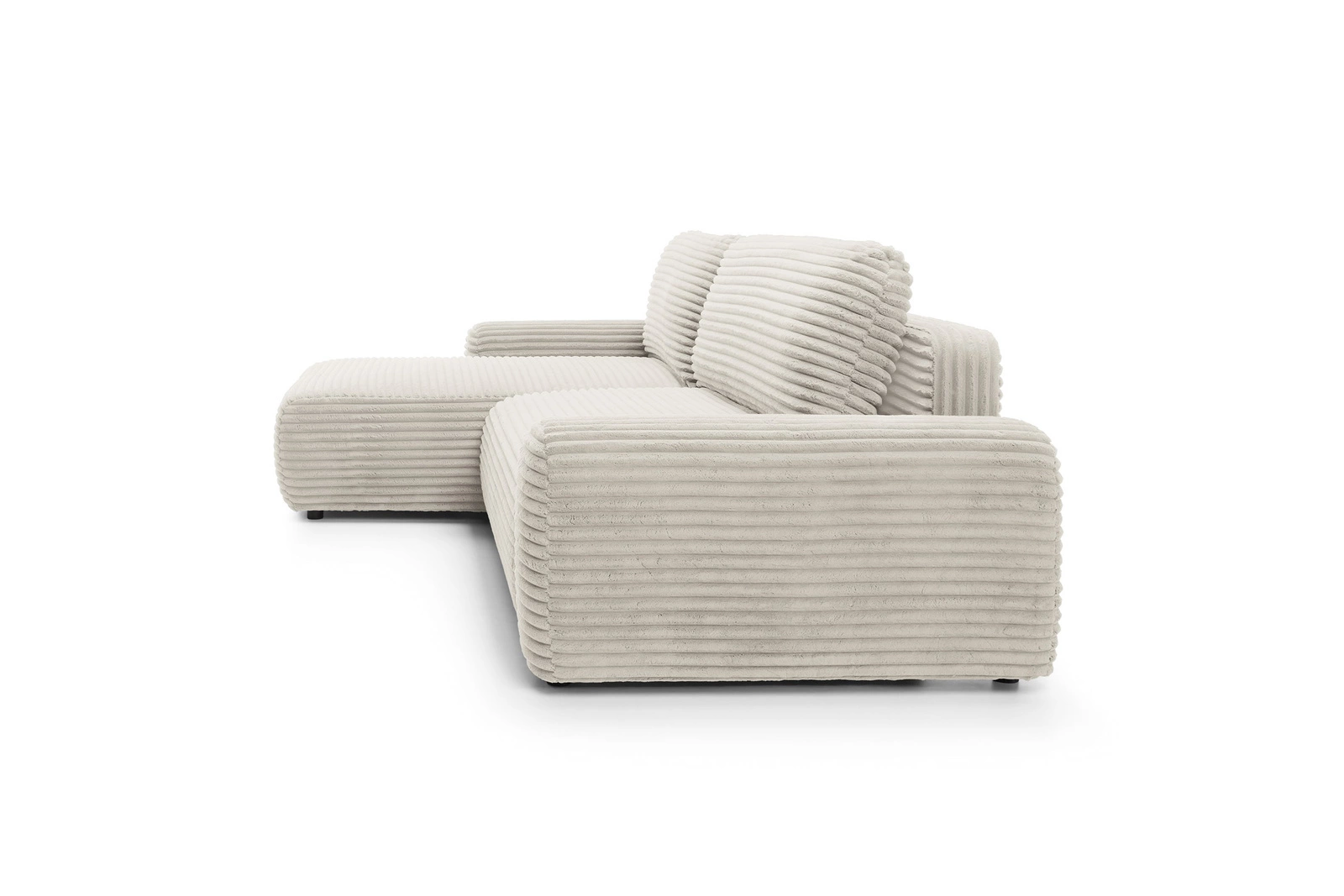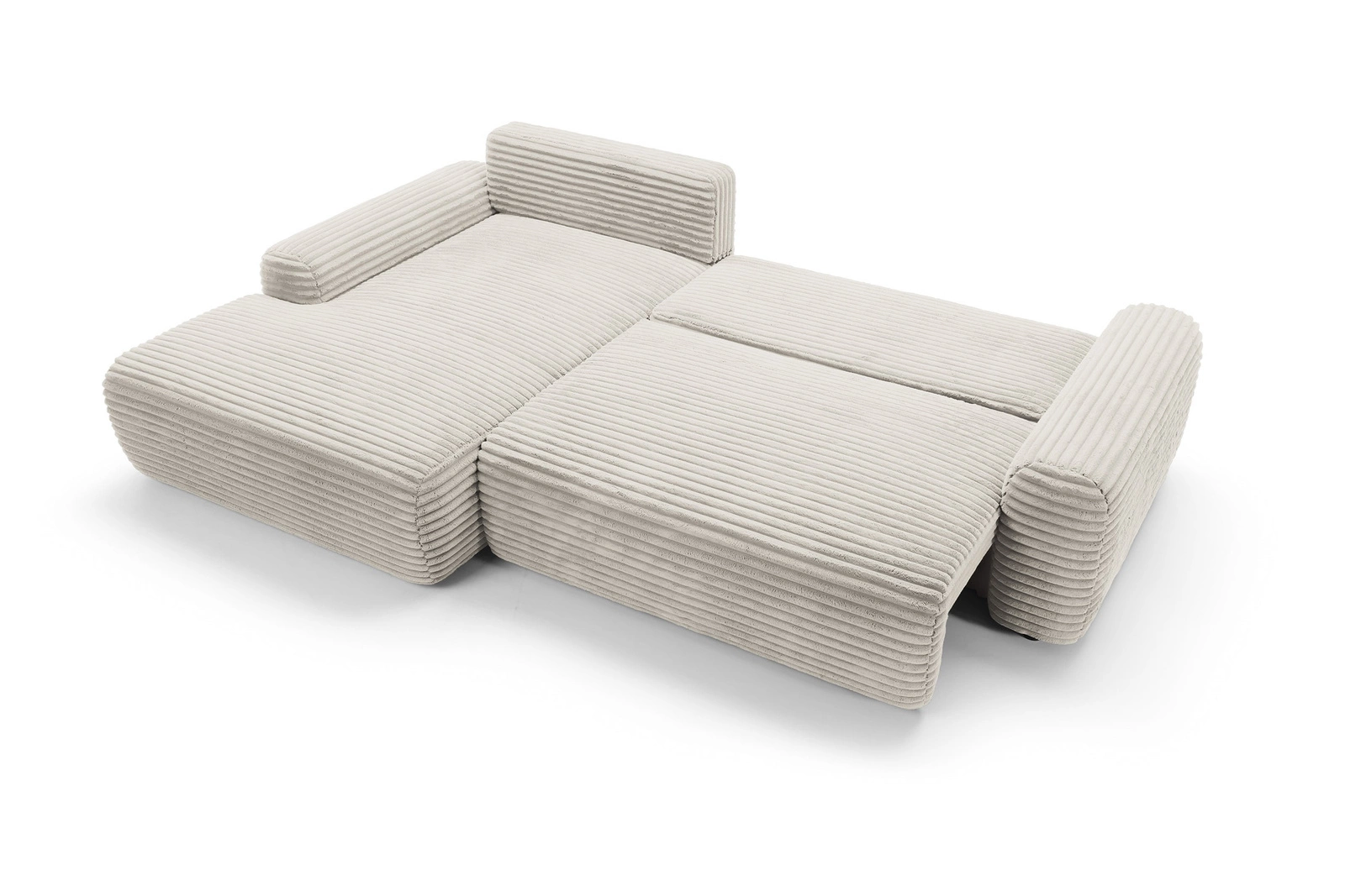 Narożnik sztruksowy z funkcją spania lewy Domle marki Intesi to połączenie nowoczesnego designu, wygody i praktyczności. Wykonany z miękkiej tkaniny sztruksowej w odcieniu jasnego beżu, wyróżnia się minimalistyczną linią oraz funkcjonalnością przemyślaną pod kątem codziennego użytkowania. Z szerokością 280 cm i głębokością 150 cm, narożnik Domle oferuje komfortowe miejsce do wypoczynku w salonie, a dodatkowo posiada wbudowaną funkcję spania i pojemny schowek na pościel.