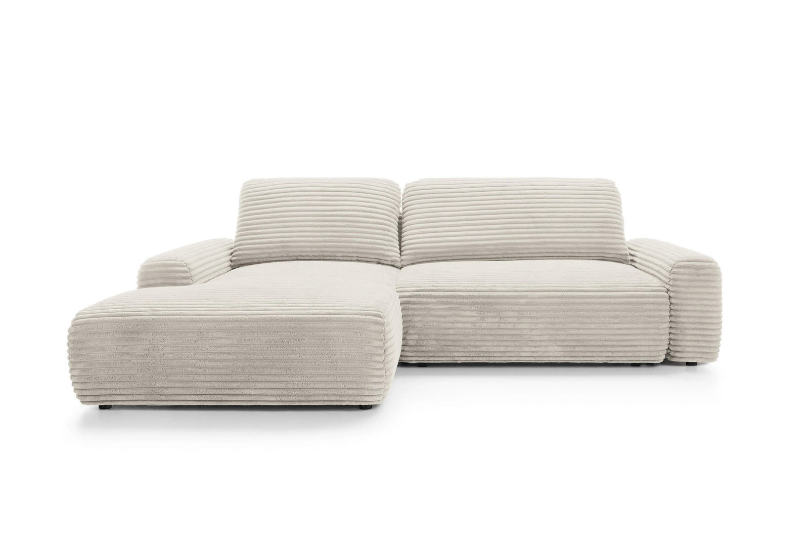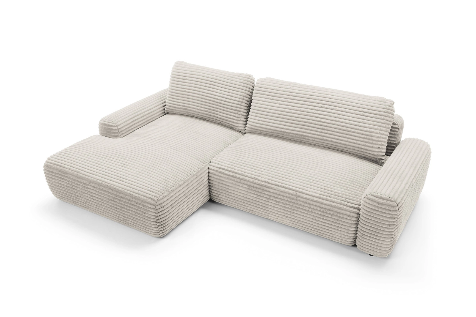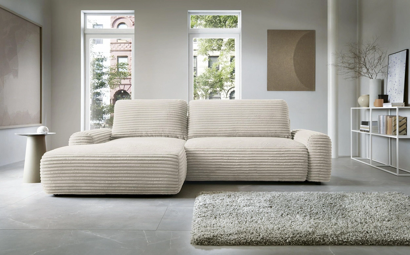 Narożnik sztruksowy z funkcją spania lewy Domle marki Intesi to połączenie nowoczesnego designu, wygody i praktyczności. Wykonany z miękkiej tkaniny sztruksowej w odcieniu jasnego beżu, wyróżnia się minimalistyczną linią oraz funkcjonalnością przemyślaną pod kątem codziennego użytkowania. Z szerokością 280 cm i głębokością 150 cm, narożnik Domle oferuje komfortowe miejsce do wypoczynku w salonie, a dodatkowo posiada wbudowaną funkcję spania i pojemny schowek na pościel.
