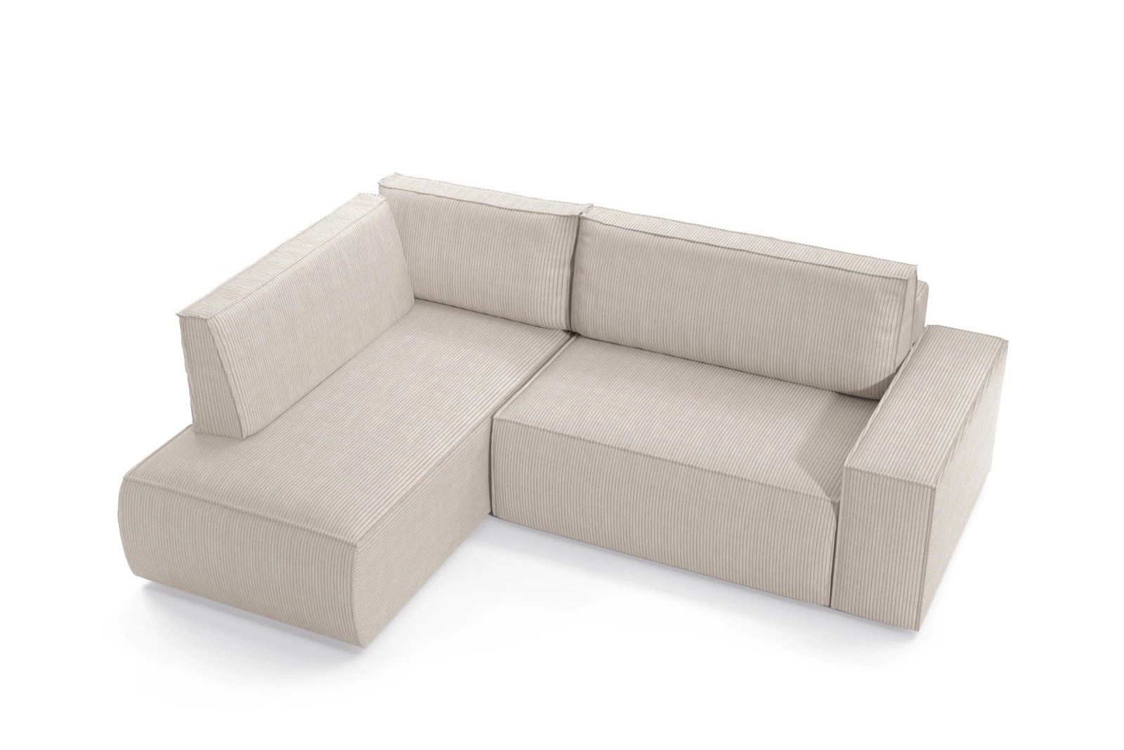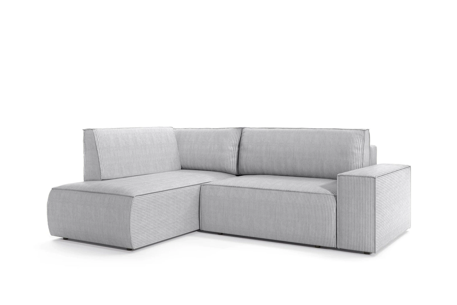 Molde L lewy w szarym kolorze przyciąga wzrok charakterystycznym sztruksem, który nadaje wnętrzu przytulności i stylu. Subtelna, stonowana barwa doskonale komponuje się z minimalistycznymi oraz skandynawskimi aranżacjami. Prosta forma narożnika podkreśla jego nowoczesny charakter, a miękkie poduchy zachęcają do relaksu po długim dniu.