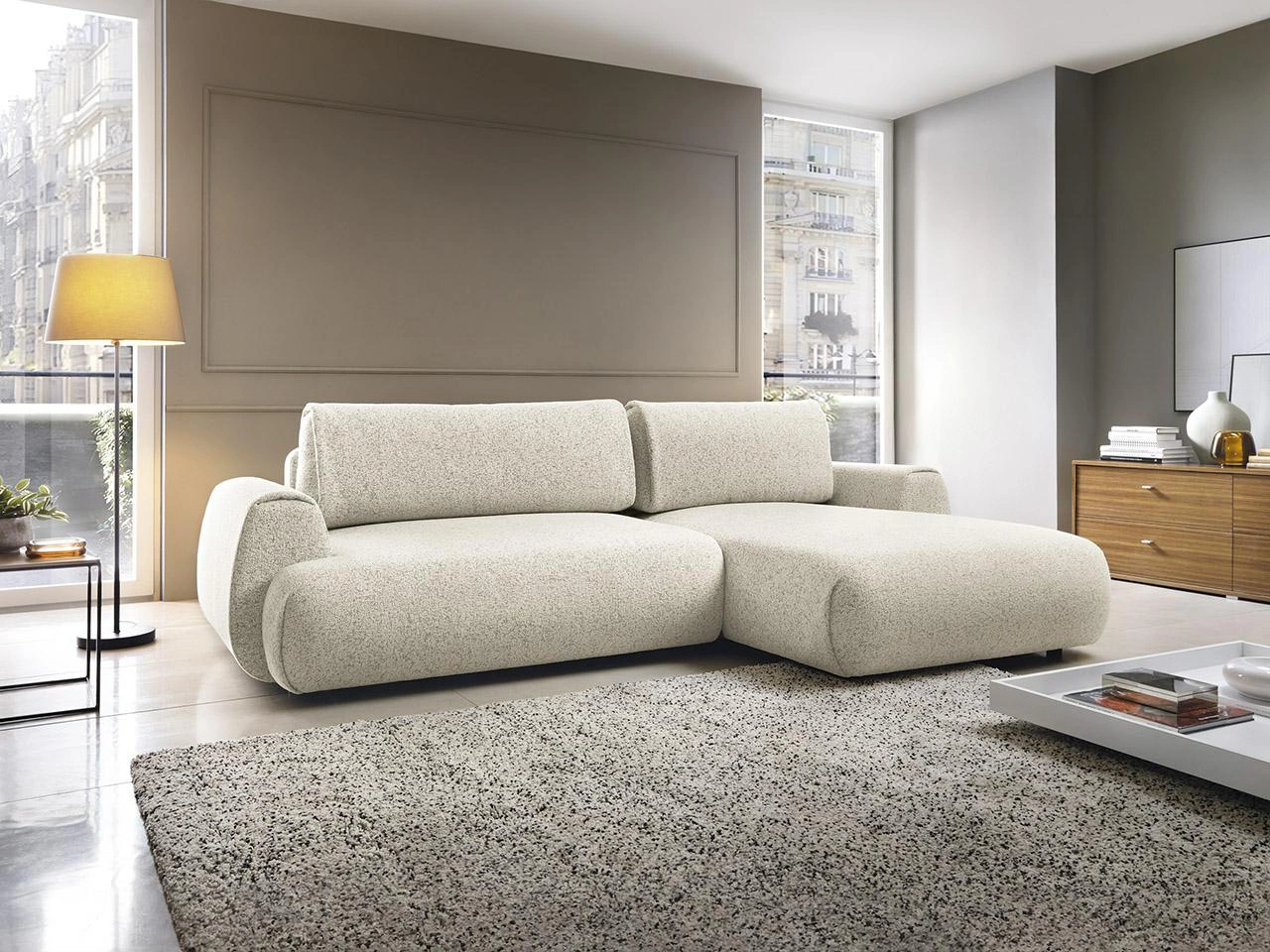 Narożnik z funkcją spania Ljung prawy marki Intesi to nowoczesny, beżowy mebel tapicerowany, który doskonale sprawdzi się w salonie jako wygodne miejsce do codziennego odpoczynku i okazjonalnego snu. Szerokość 270 cm, głębokość 167 cm oraz powierzchnia spania 213×130 cm zapewniają komfort zarówno podczas relaksu z rodziną, jak i w trakcie wizyty gości. Model ten wyróżnia się minimalistyczną formą, praktycznym pojemnikiem na pościel oraz wysoką jakością tkaniny, która zachwyca miękkością i subtelnością jasnobeżowego koloru.