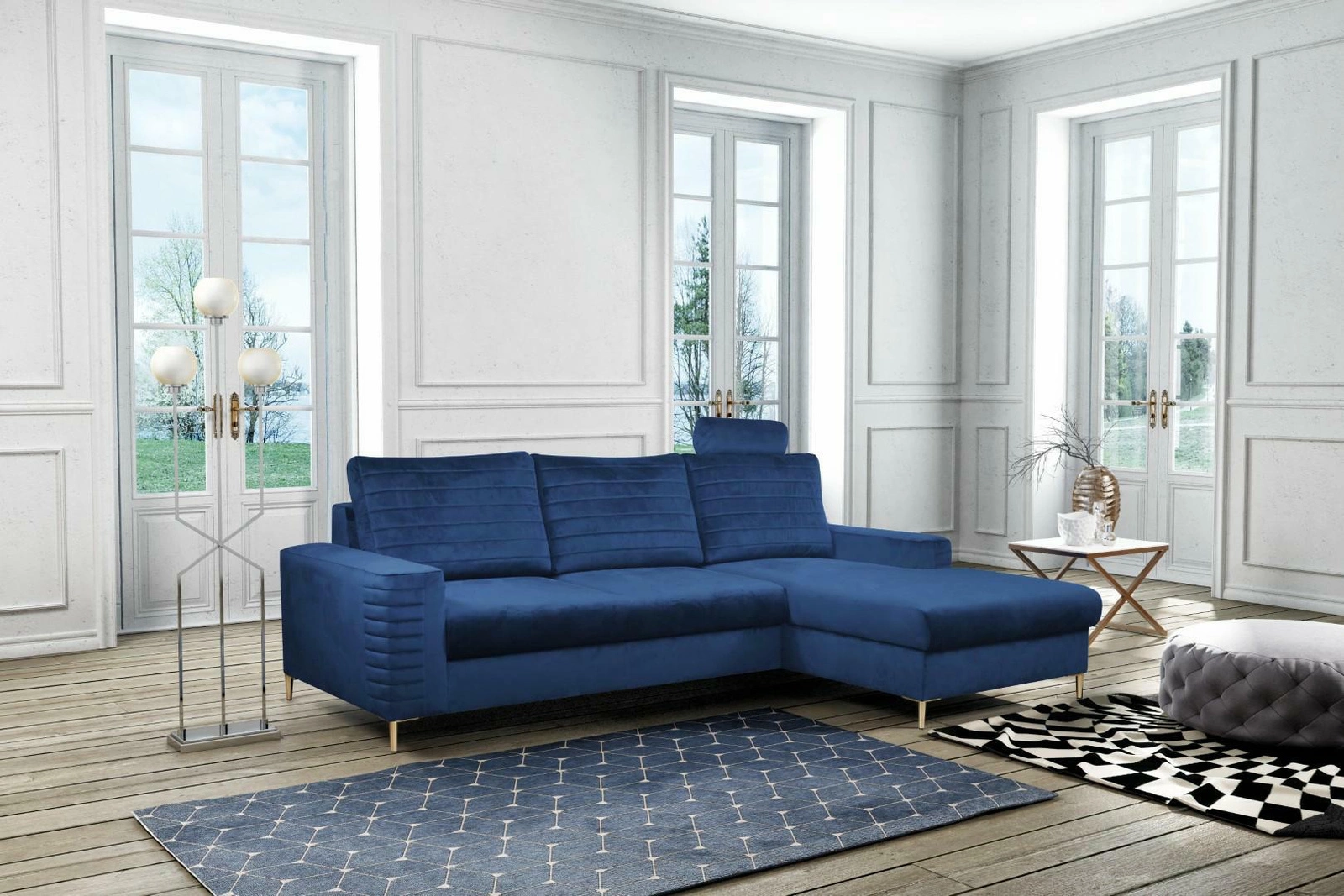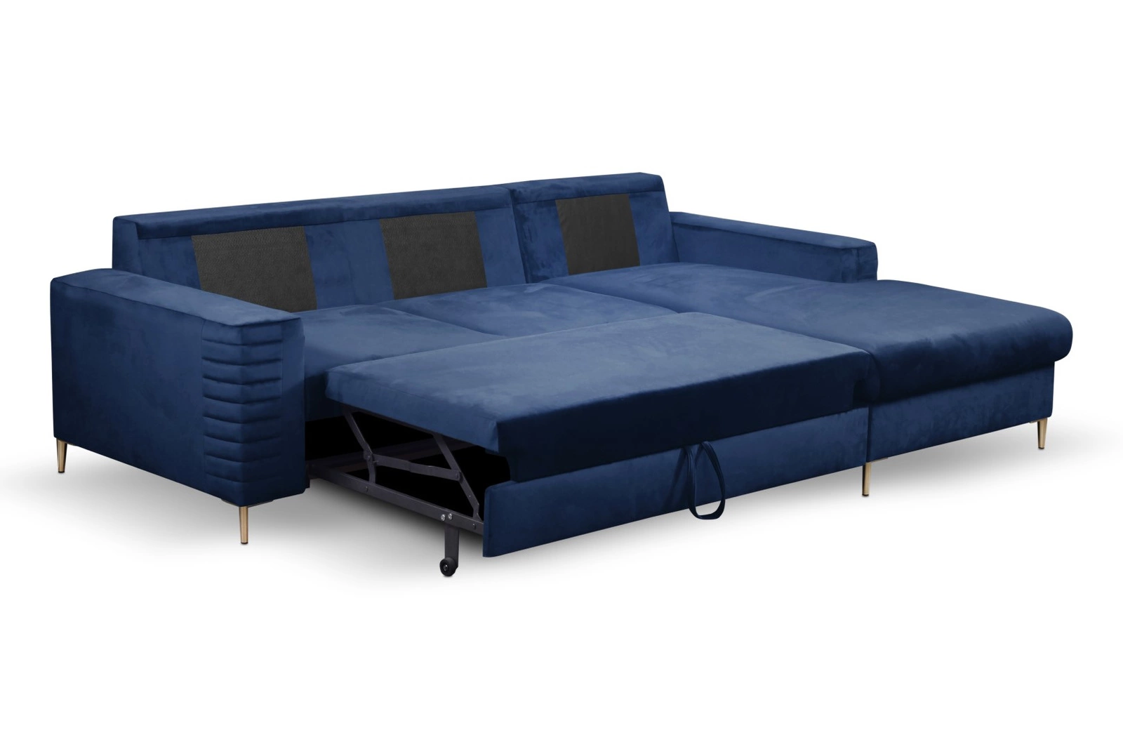 Narożnik z funkcją spania Hald marki Intesi to połączenie nowoczesnego designu, komfortowej welurowej tkaniny i praktycznych rozwiązań do salonu. Model w eleganckim, głębokim granatowym kolorze, z prawostronnym układem i złotymi metalowymi nóżkami, oferuje przestrzeń do codziennego wypoczynku oraz wygodne miejsce do spania o powierzchni 140×212 cm. Dzięki pojemnikowi na pościel narożnik jest nie tylko stylowy, ale także niezwykle funkcjonalny.