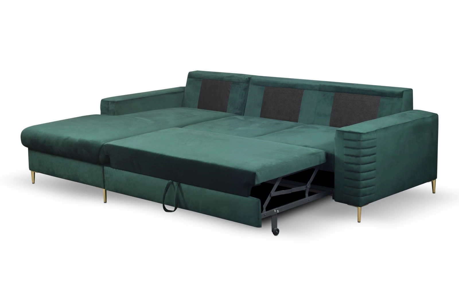 Narożnik z funkcją spania Hald marki Intesi to nowoczesny mebel tapicerowany welurową tkaniną w głębokim odcieniu butelkowej zieleni. Lewostronna konstrukcja, szerokość 253 cm oraz powierzchnia spania 140x212 cm sprawiają, że model ten idealnie łączy komfort codziennego wypoczynku z praktycznym rozwiązaniem dla gości. Eleganckie złote nóżki i pojemnik na pościel podkreślają jego funkcjonalność i stylowy charakter.