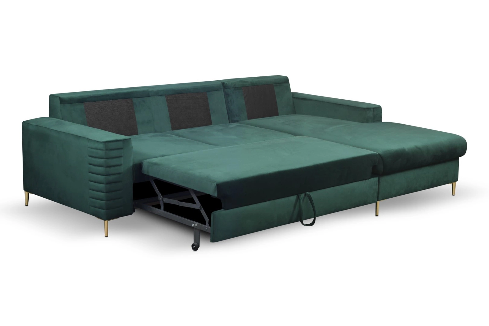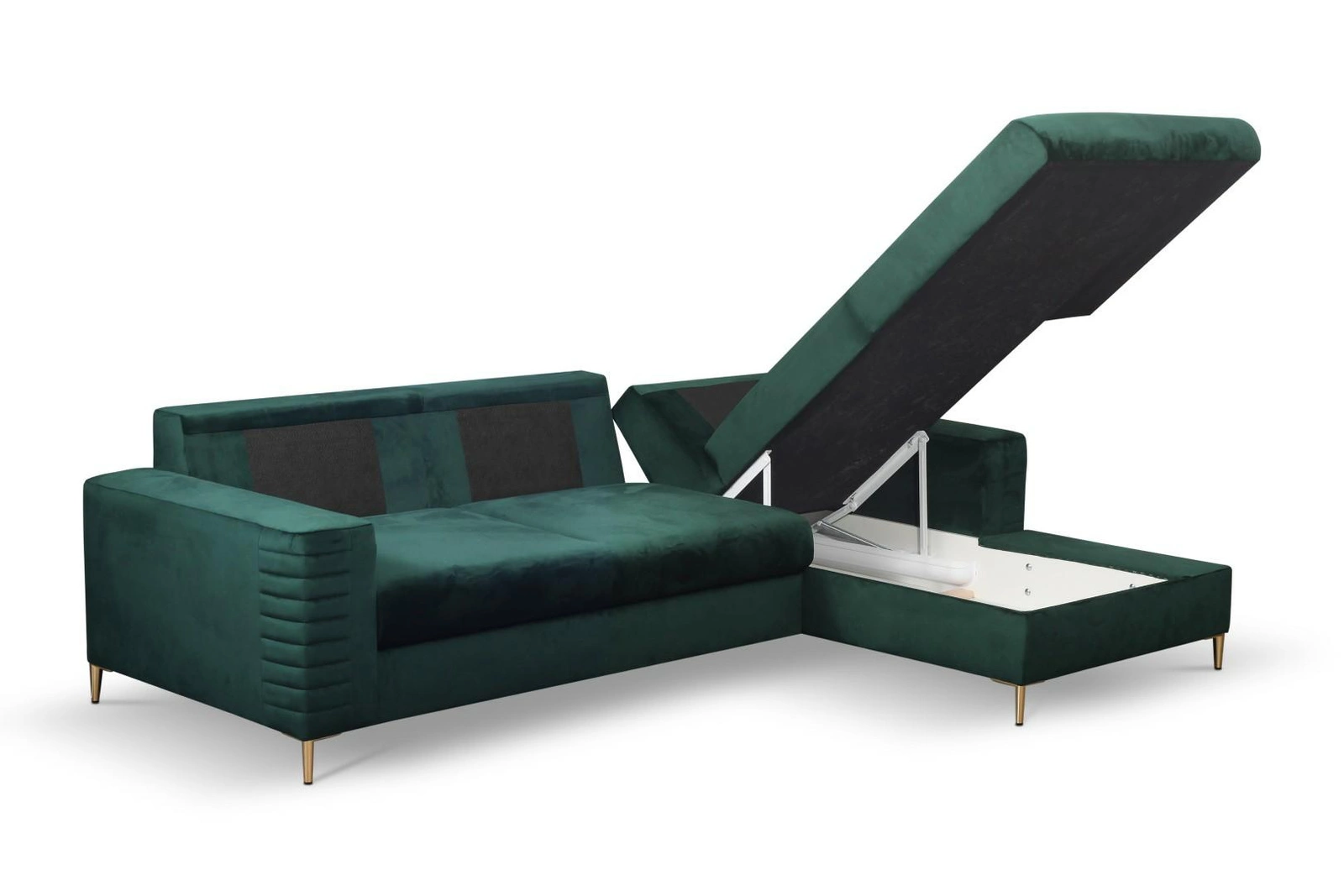 Narożnik z funkcją spania Hald marki Intesi to elegancka kanapa narożna w stylu nowoczesnym, tapicerowana aksamitnym welurem w odcieniu butelkowej zieleni. Oferuje komfortowe miejsce do siedzenia dla trzech osób, rozkładane łóżko o powierzchni spania 140x212 cm oraz pojemnik na pościel. Stabilna podstawa na złotych, metalowych nóżkach nadaje meblowi wyrazistego charakteru i lekkości.