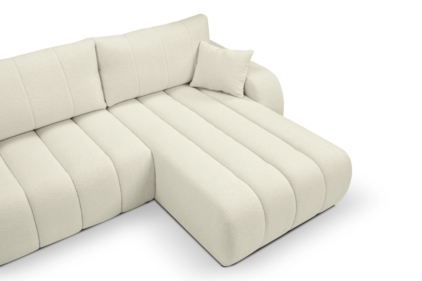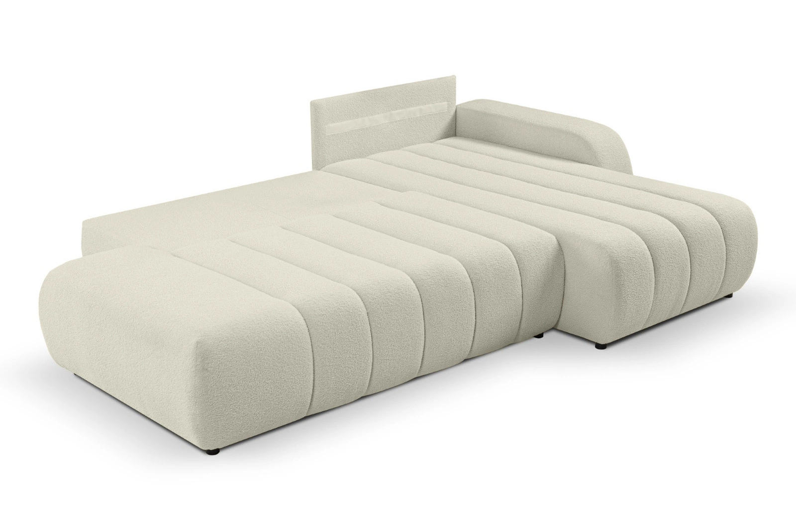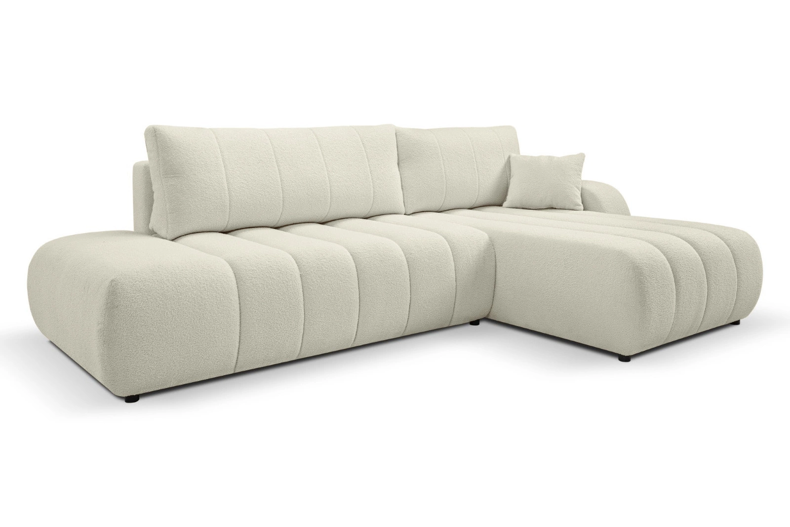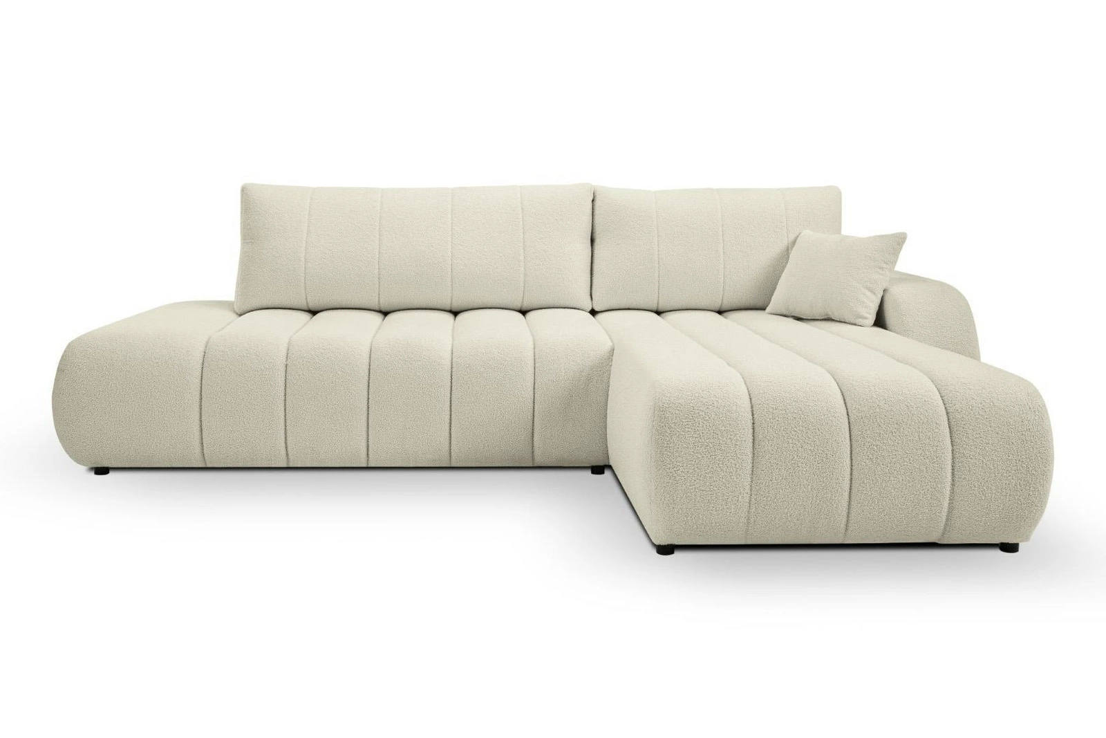 Narożnik Hobro marki Intesi to nowoczesny narożnik z funkcją spania, wykonany z przyjemnej w dotyku tkaniny w kolorze białym, osadzony na subtelnych czarnych nogach. Model ten oferuje dużą powierzchnię spania 145x212 cm, przestronny pojemnik na pościel oraz komfortowe siedzisko wypełnione pianką tapicerską. Jego prawostronny układ sprawia, że doskonale sprawdzi się jako centralny punkt nowoczesnego salonu.