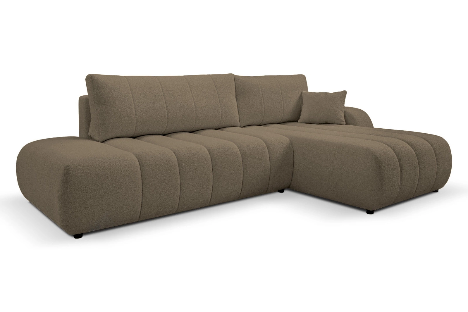 Szaro-brązowa tapicerka oraz prosta, geometryczna bryła wpisują się w nowoczesne trendy wnętrzarskie. Model Hobro posiada zdejmowane poduszki oparciowe, które ułatwiają utrzymanie porządku i personalizację strefy relaksu. Czarna, lekko uniesiona podstawa na sześciu nogach nadaje narożnikowi lekkości oraz ułatwia sprzątanie pod meblem. Funkcjonalny pojemnik na pościel pozwala zaoszczędzić miejsce w szafie, a wygodne podłokietniki sprzyjają relaksowi po długim dniu.