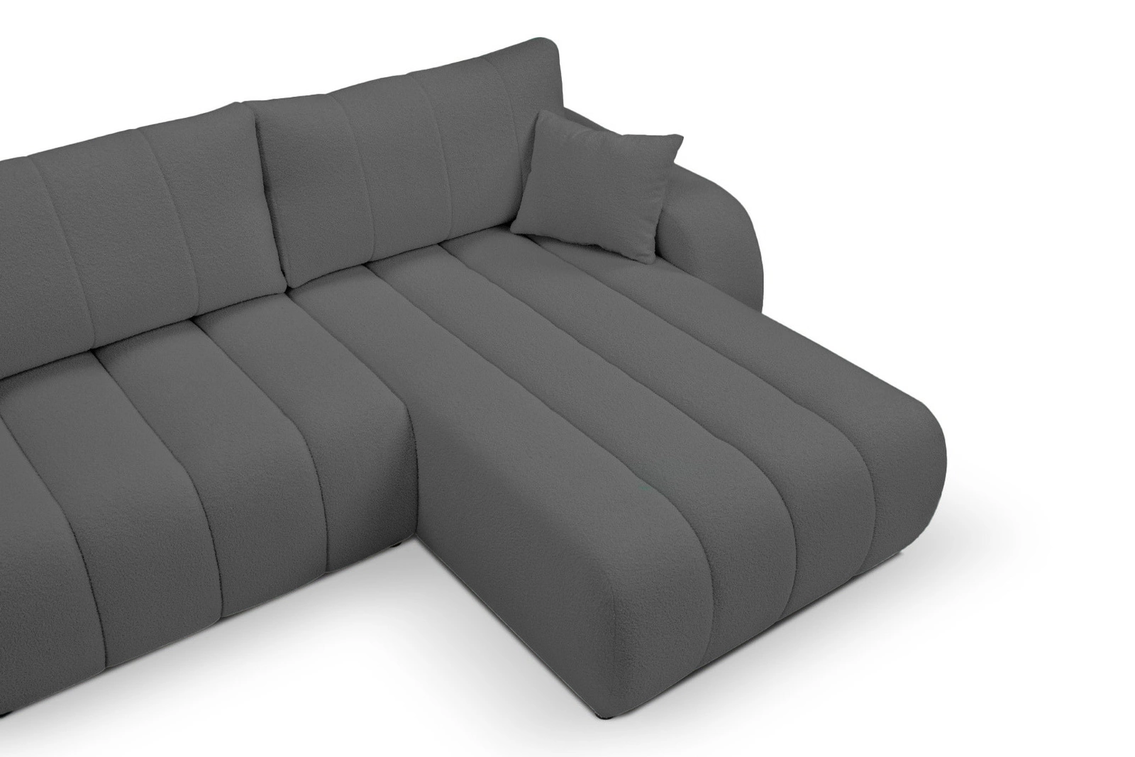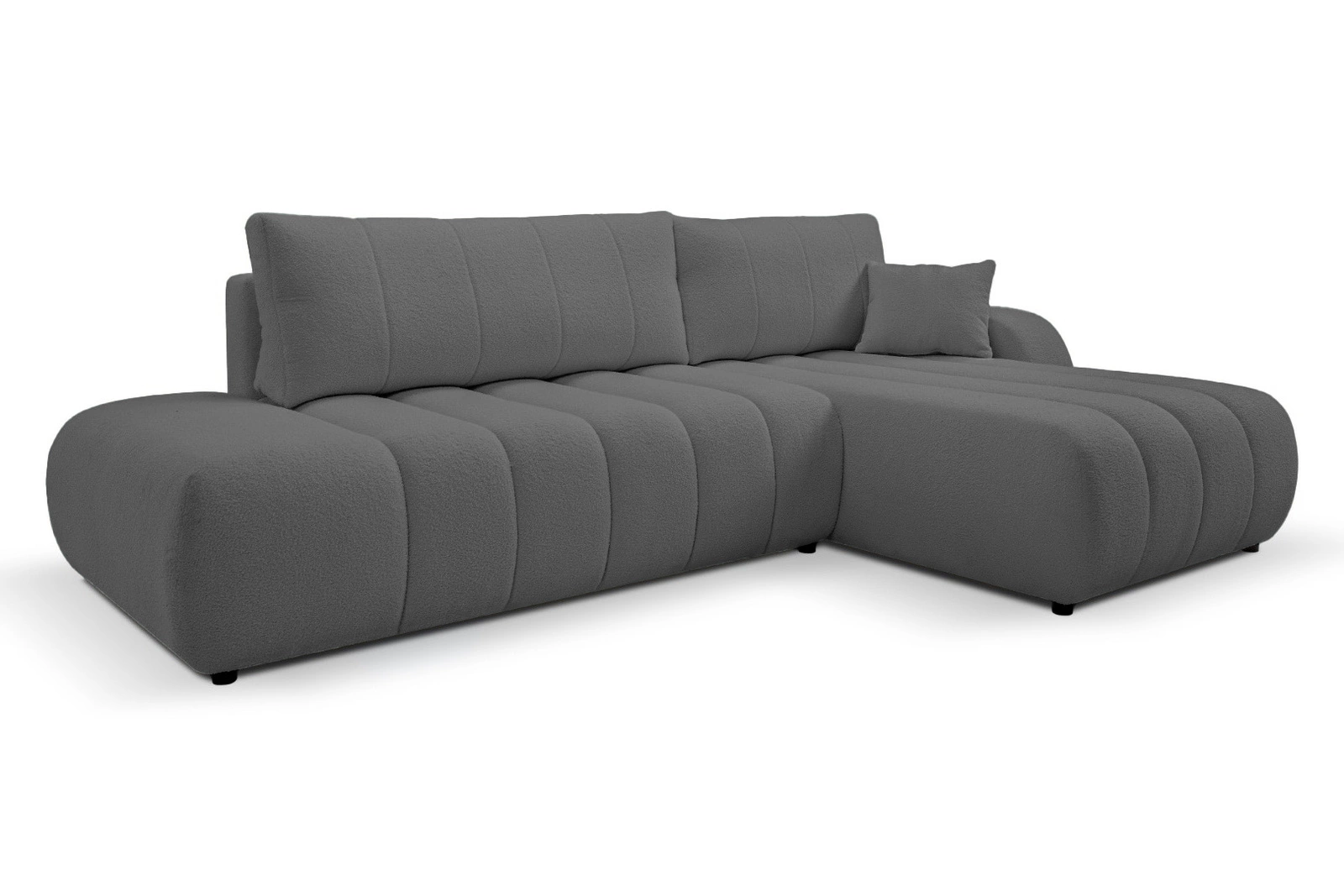 Minimalistyczna linia narożnika Hobro świetnie wpisuje się w nowoczesne aranżacje salonów, dodając wnętrzu lekkości i elegancji. Tapicerka w odcieniu ciemnej szarości pięknie komponuje się z czarną podstawą na sześciu smukłych nóżkach, co dodatkowo podkreśla lekkość bryły. Wypełnienie z elastycznej pianki tapicerskiej zapewnia wygodę zarówno podczas siedzenia, jak i snu, dzięki czemu narożnik rozkładany Hobro może służyć jako kanapa narożna do codziennego użytkowania.
