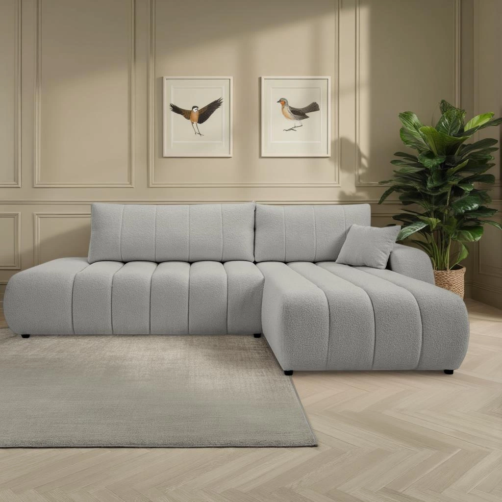 Szary narożnik Hobro harmonijnie łączy minimalistyczny styl z praktycznymi rozwiązaniami, które docenisz podczas codziennego użytkowania. Jego geometryczna, lekka forma podkreśla nowoczesny charakter salonu, a wyraźnie zaznaczone podłokietniki i wysokie, czarne nóżki nadają mu lekkości oraz ułatwiają utrzymanie porządku pod meblem. Narożnik rozkładany Hobro to propozycja dla osób, które szukają modnych i ponadczasowych rozwiązań do salonu, sypialni lub pokoju młodzieżowego.