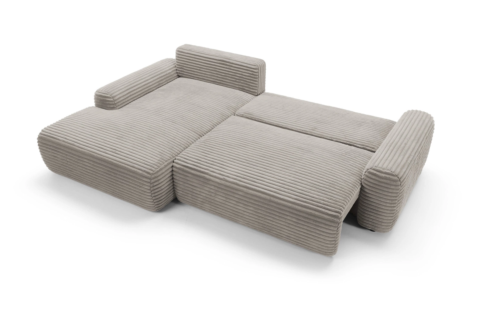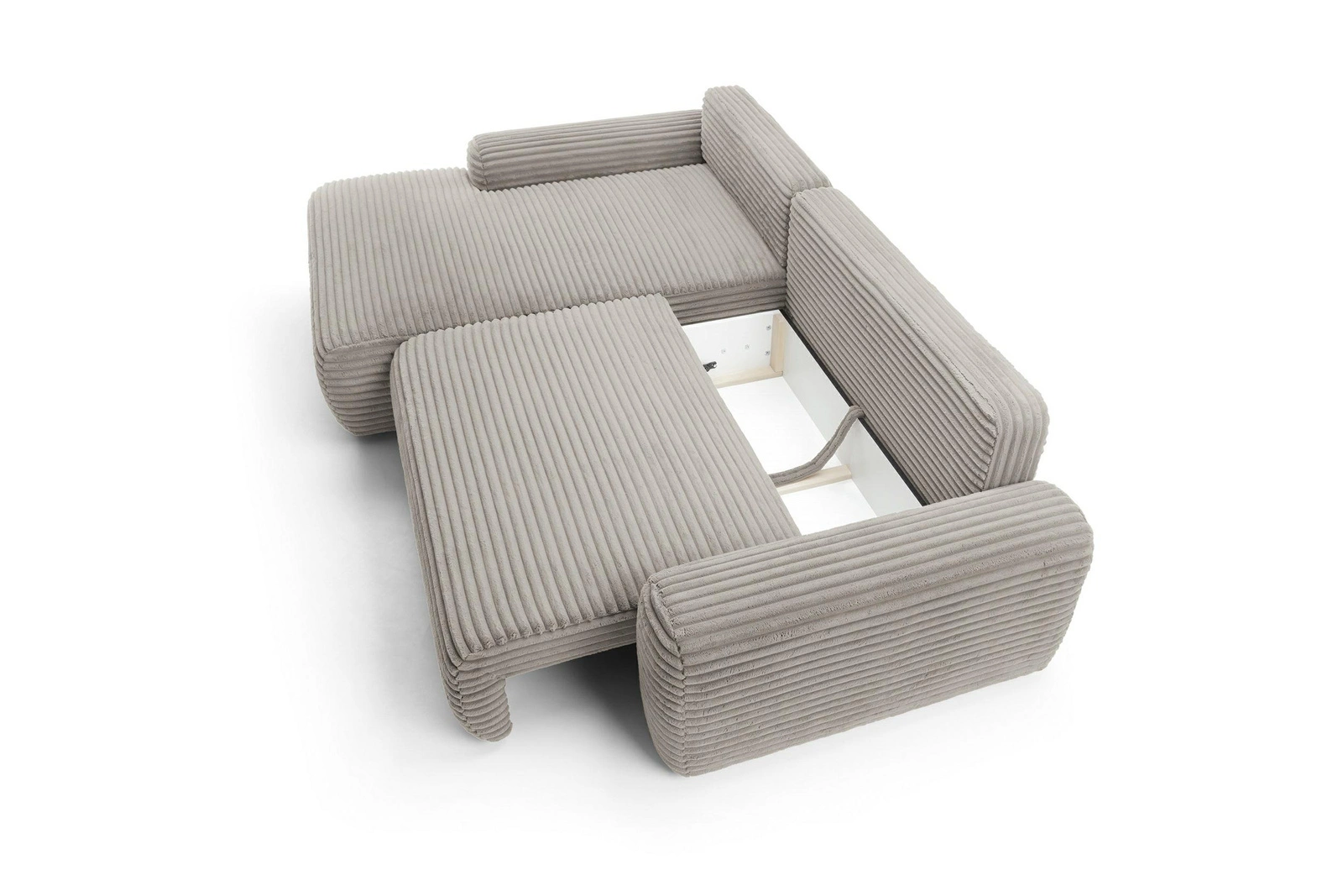 Funkcja spania to kluczowy atut tego modelu. Narożnik rozkładany Domle pozwala na szybkie przekształcenie go w wygodne łóżko o powierzchni 210×135 cm – idealne do codziennego spania lub jako dodatkowe miejsce dla gości. Pojemnik na pościel ułatwia przechowywanie kołder i poduszek, zachowując porządek w salonie bez konieczności szukania miejsca na tekstylia.