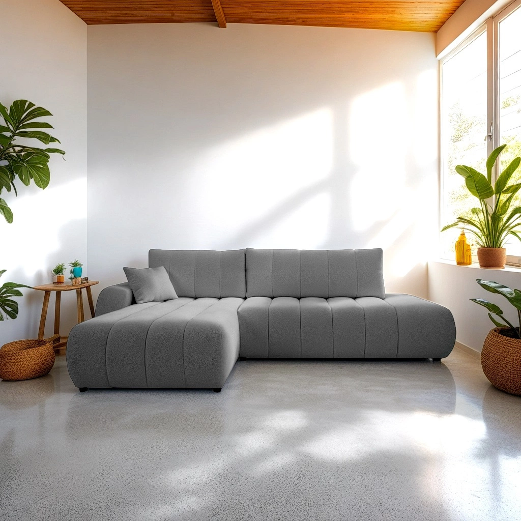 Narożnik z funkcją spania lewy Hobro marki Intesi to nowoczesny, szary narożnik do salonu, łączący minimalistyczny design z wysoką funkcjonalnością. Wyposażony w wygodną powierzchnię spania 145x212 cm, pojemnik na pościel oraz zdejmowane poduszki, zapewnia wygodę zarówno podczas codziennego wypoczynku, jak i nocnego relaksu. Szerokość 276 cm i głębokość 176 cm sprawiają, że jest to komfortowy narożnik rozkładany do większych i średnich salonów, idealny dla osób ceniących praktyczne rozwiązania w nowoczesnym stylu.