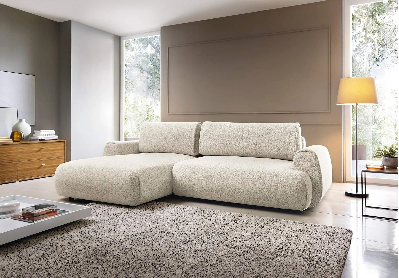 Narożnik z funkcją spania lewy Ljung marki Intesi to nowoczesny mebel wypoczynkowy, który wyróżnia się beżową, przyjemną w dotyku tkaniną oraz praktycznym pojemnikiem na pościel. Zapewnia dużą powierzchnię do siedzenia (270×167 cm) i wygodne miejsce do snu o wymiarach 213×130 cm. To doskonały wybór do salonu, gdzie liczy się zarówno komfort codziennego relaksu, jak i możliwość przenocowania gości.