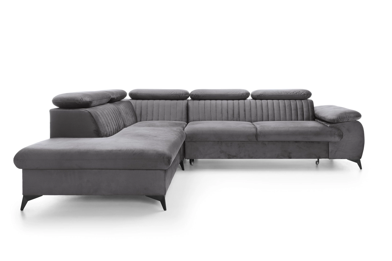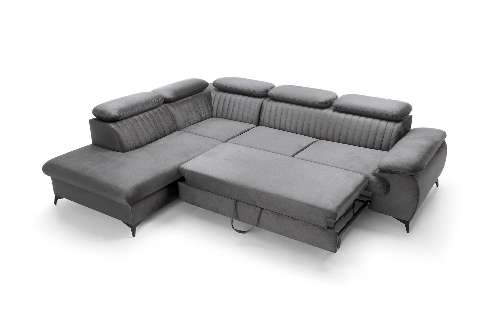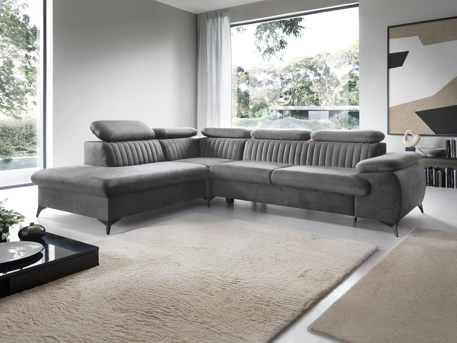Narożnik z funkcją spania lewy Lund L marki Intesi to nowoczesny mebel wypoczynkowy do salonu, wykonany z wytrzymałej tkaniny w odcieniu szarości i wsparty na solidnej, metalowej podstawie. Oferuje dużą powierzchnię użytkową (szerokość 275 cm, głębokość 177 cm) oraz wygodne miejsce do codziennego spania o wymiarach 194×124 cm. Wyposażony został w pojemnik na pościel, regulowane zagłówki i szerokie podłokietniki, co czyni go funkcjonalnym centrum domowego relaksu.
