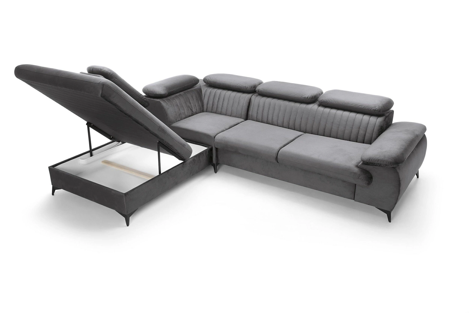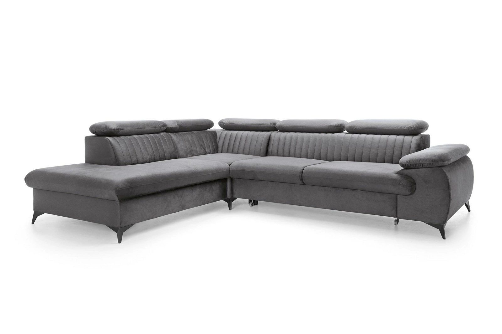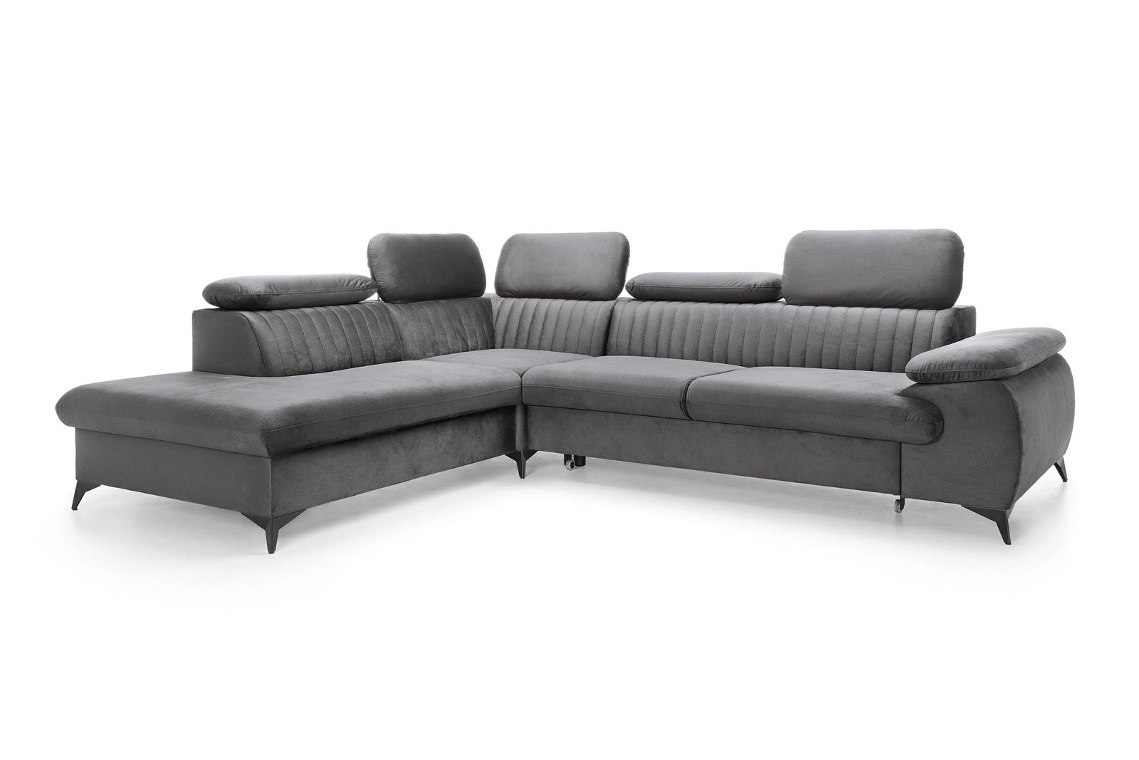 Narożnik z funkcją spania lewy Lund L marki Intesi to nowoczesny mebel wypoczynkowy do salonu, wykonany z wytrzymałej tkaniny w odcieniu szarości i wsparty na solidnej, metalowej podstawie. Oferuje dużą powierzchnię użytkową (szerokość 275 cm, głębokość 177 cm) oraz wygodne miejsce do codziennego spania o wymiarach 194×124 cm. Wyposażony został w pojemnik na pościel, regulowane zagłówki i szerokie podłokietniki, co czyni go funkcjonalnym centrum domowego relaksu.