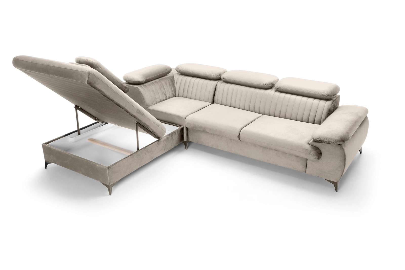 Dzięki przemyślanej konstrukcji, narożnik Lund L lewy oferuje znacznie więcej niż tradycyjna kanapa narożna. Oprócz funkcji spania znajdziesz w nim praktyczny pojemnik na pościel, który pozwala łatwo przechować koce, poduszki czy pościel, a regulowane zagłówki umożliwiają wygodne podparcie głowy podczas wypoczynku. To rozwiązanie, które sprawdzi się zarówno w większych, jak i mniejszych salonach, gdzie liczy się każdy centymetr przestrzeni.