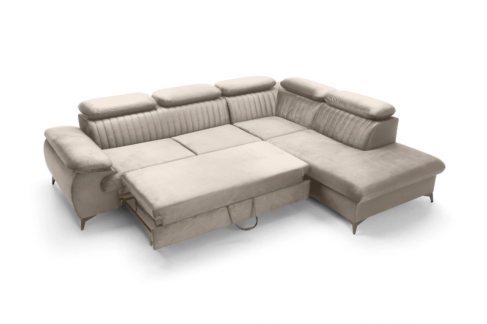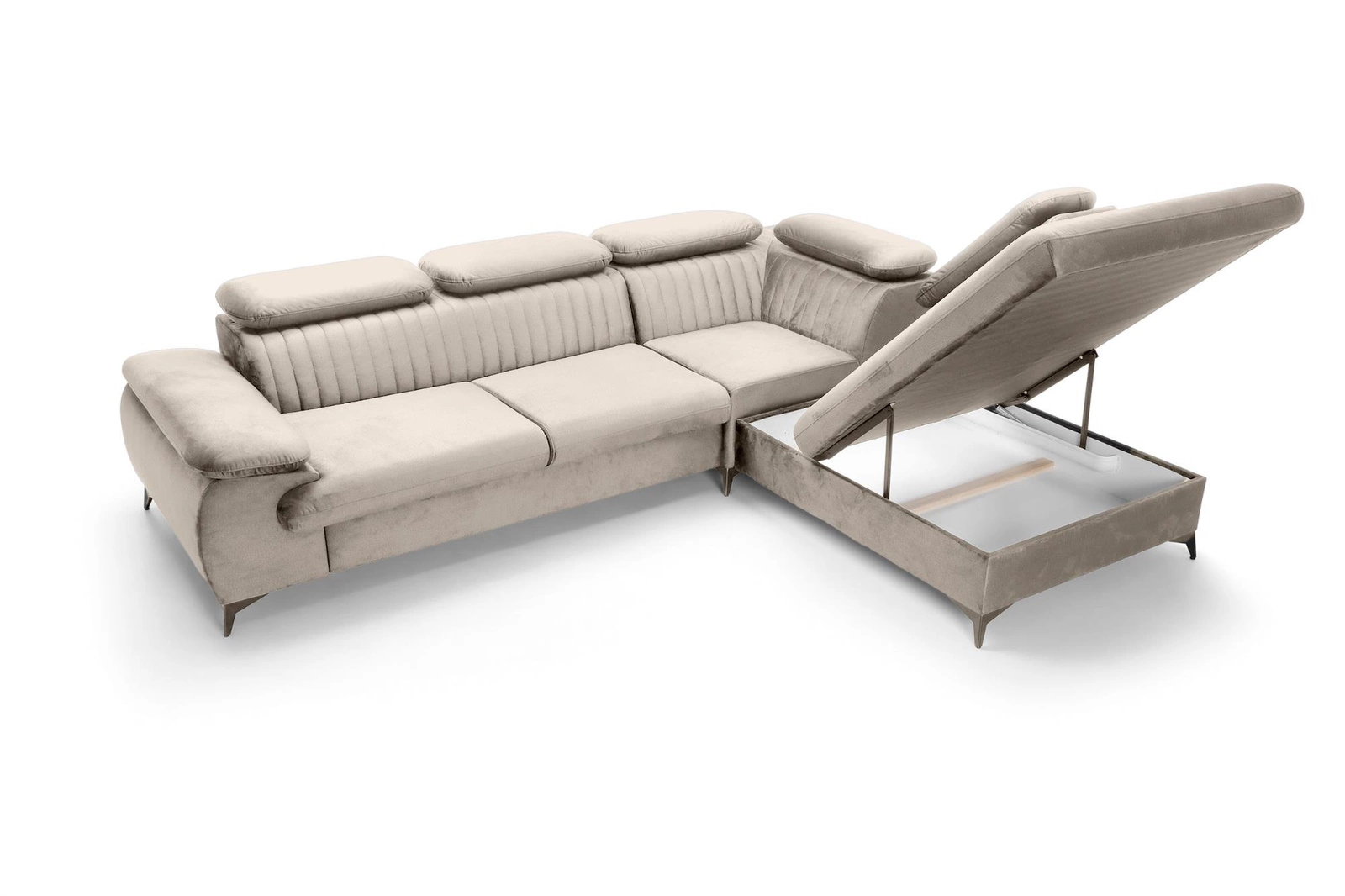 - Funkcja spania i pojemnik na pościel – łatwo zmienisz narożnik w wygodne łóżko oraz przechowasz dodatkową pościel czy koce