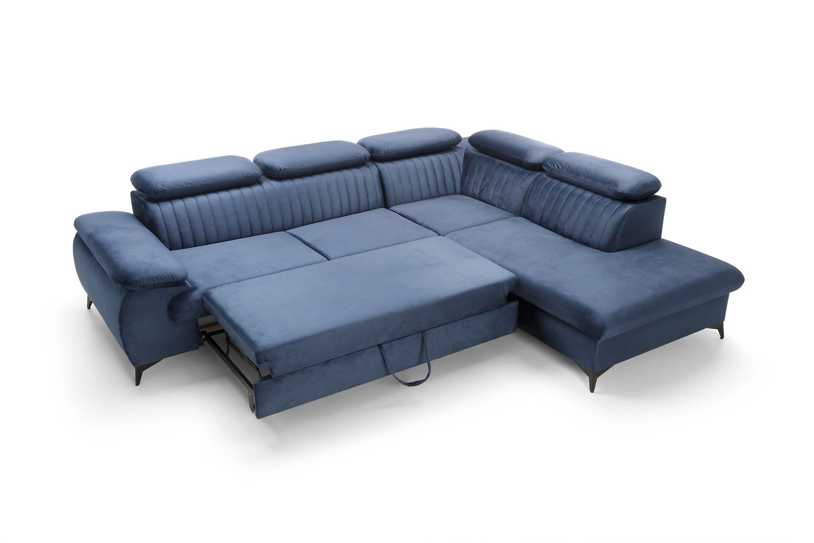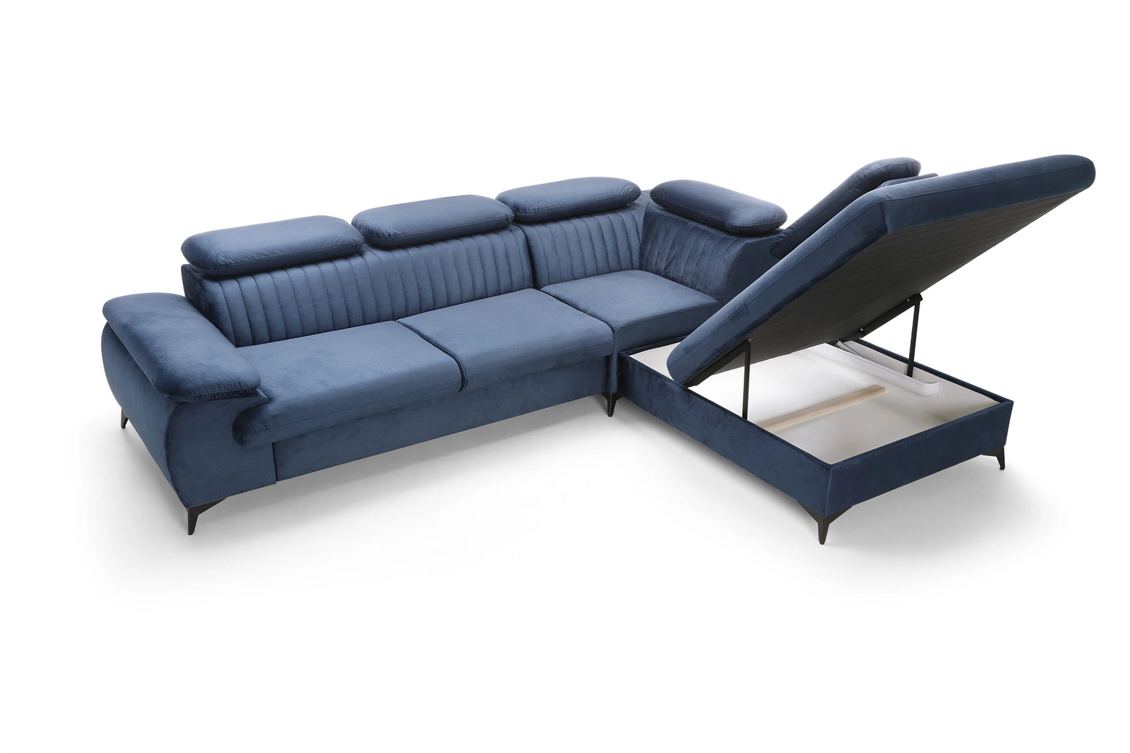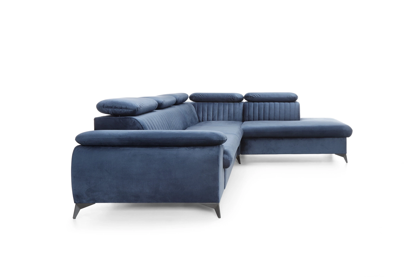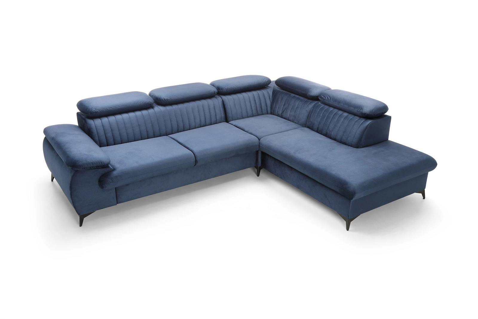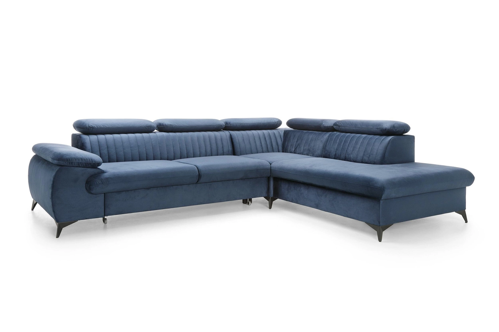 Narożnik Lund L prawy marki Intesi to nowoczesny mebel wypoczynkowy, który łączy w sobie funkcję spania, praktyczny pojemnik na pościel i regulowane zagłówki. Granatowa tapicerka o gładkiej strukturze nadaje mu wyjątkowy charakter, a duża powierzchnia siedziska (275 × 177 cm) oraz komfortowa strefa spania (194 × 124 cm) czynią go idealnym wyborem do salonu. Wysokie, czarne nóżki podkreślają minimalistyczny styl i ułatwiają utrzymanie czystości pod meblem.