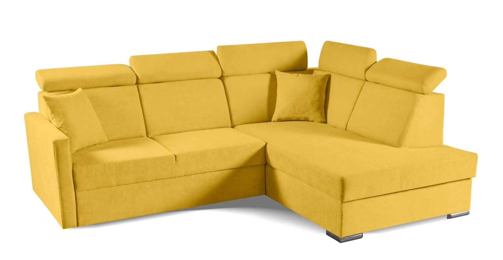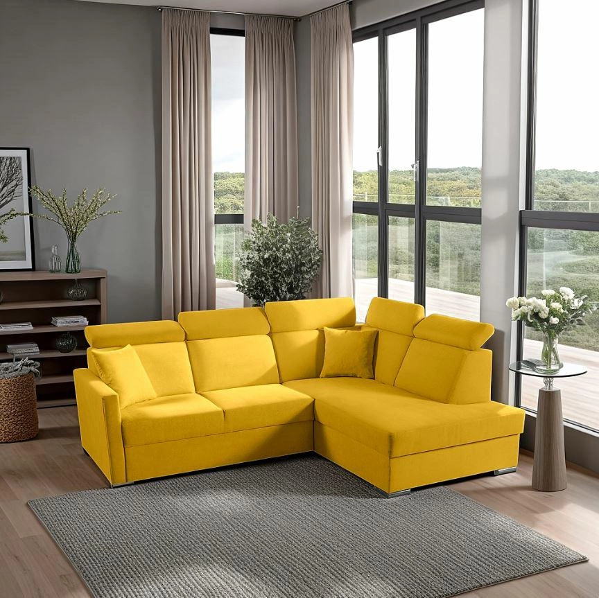 Narożnik z funkcją spania Mils XL marki Intesi to nowoczesny, prawostronny narożnik do salonu w modnym musztardowym kolorze. Pokryty przyjemną w dotyku, aksamitną tkaniną, łączy komfortową powierzchnię spania 120×195 cm, praktyczny pojemnik na pościel oraz ergonomiczne oparcie z podłokietnikami. Dzięki przemyślanym wymiarom i funkcjonalnym rozwiązaniom, doskonale sprawdzi się jako kanapa narożna do codziennego wypoczynku, a także jako wygodny narożnik rozkładany na okazjonalny lub nawet codzienny sen.
