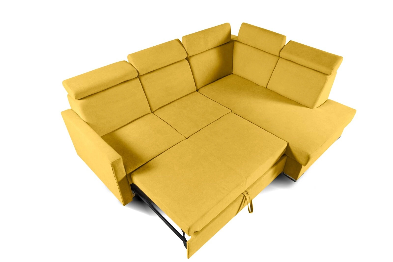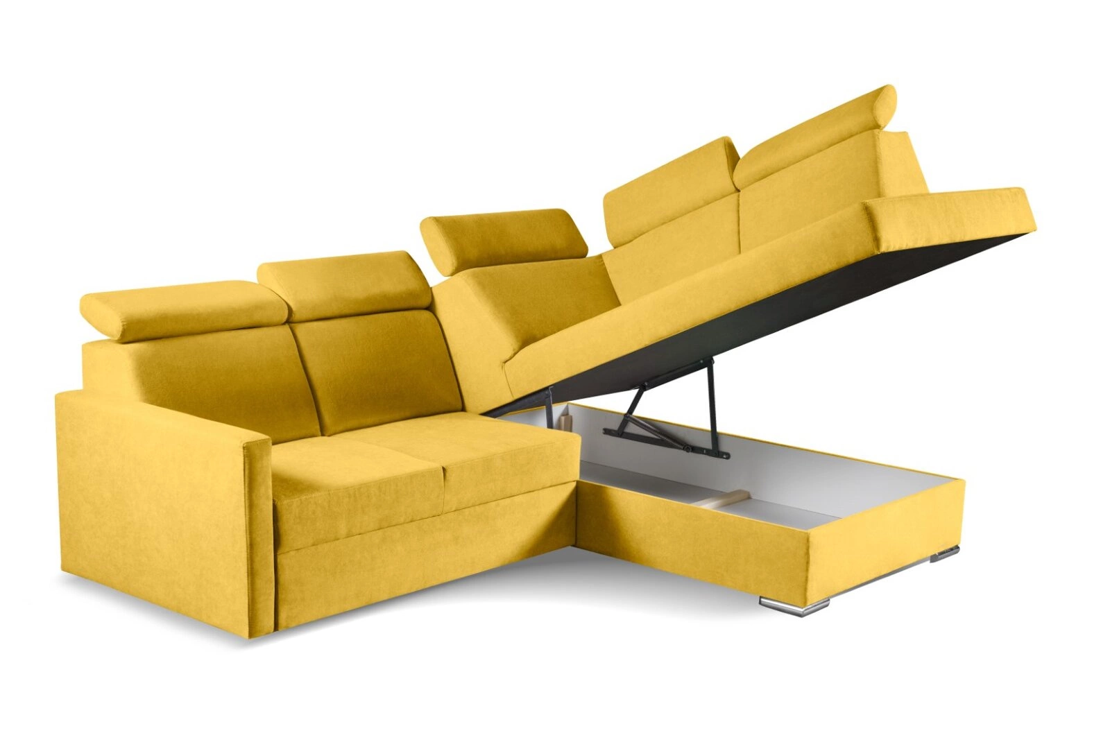 - Funkcja spania i pojemnik na pościel – zyskujesz wygodną kanapę narożną i miejsce do przechowywania w jednym meblu