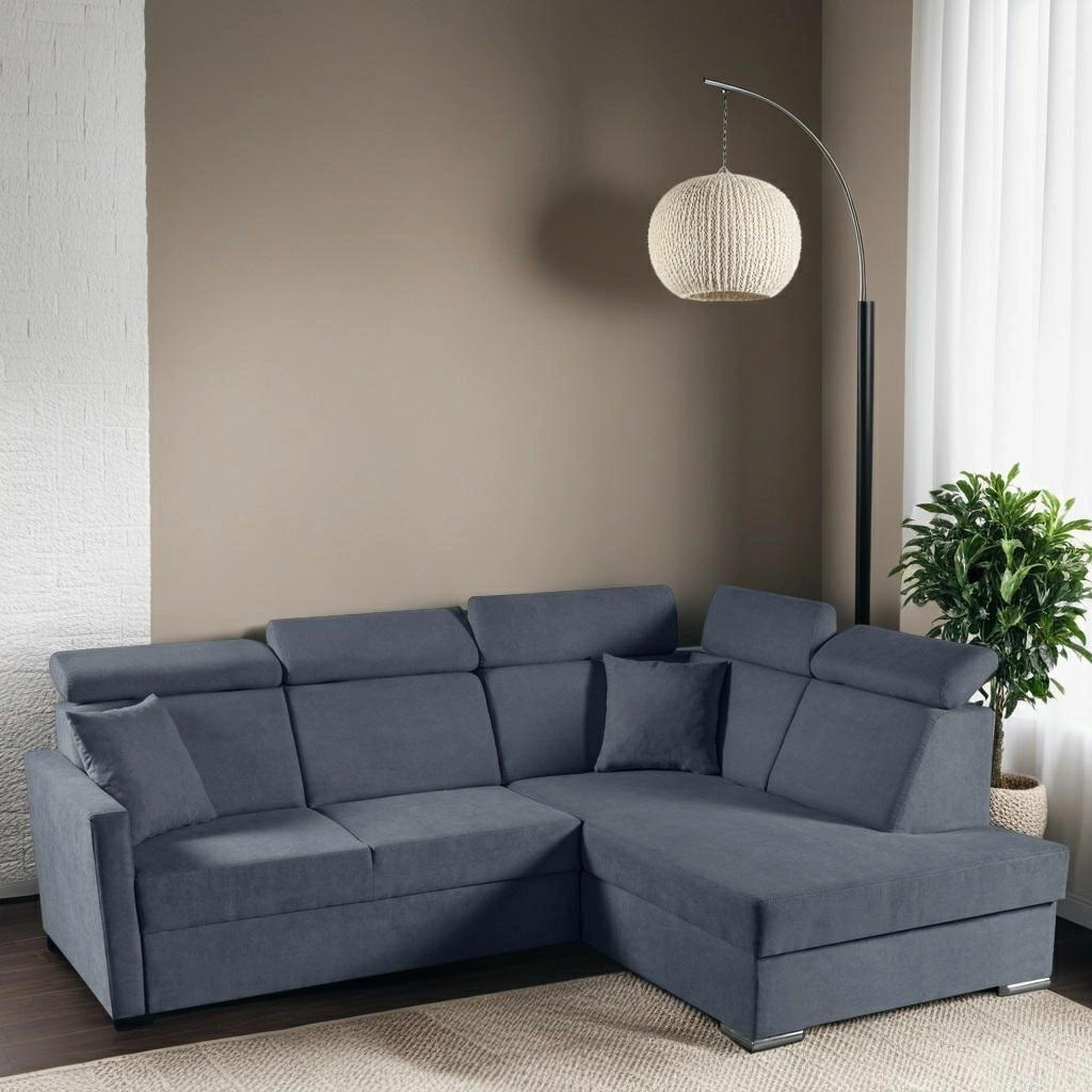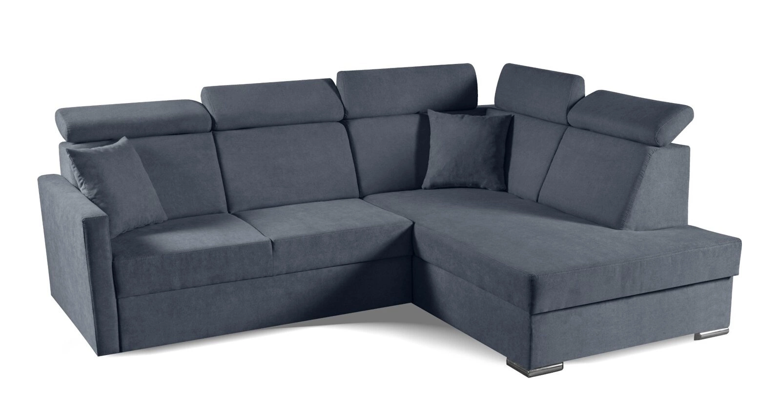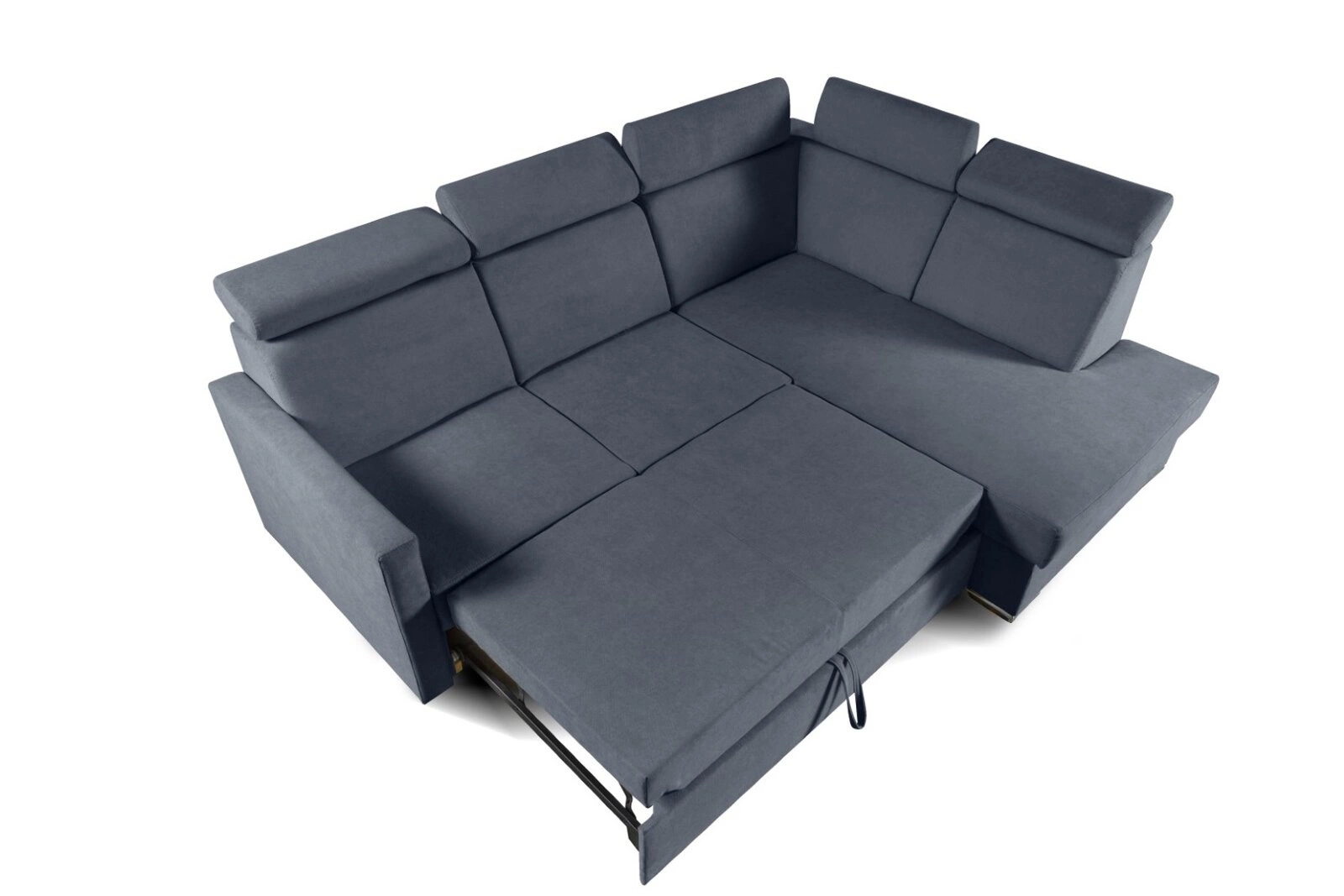 Dzięki zastosowaniu sprężyn falistych i pianki tapicerskiej, siedzisko narożnika zapewnia odpowiednie podparcie i komfort nawet podczas wielogodzinnego wypoczynku. Rozkładany mechanizm typu DL pozwala szybko i łatwo przekształcić narożnik w wygodne łóżko do spania codziennego. Dodatkowy pojemnik na pościel ułatwia organizację przestrzeni, a regulowany zagłówek i szerokie podłokietniki wspierają relaks na najwyższym poziomie.