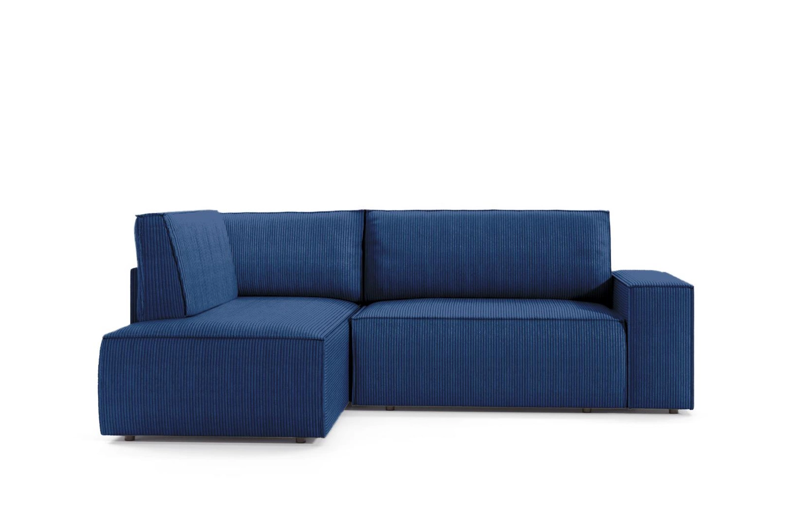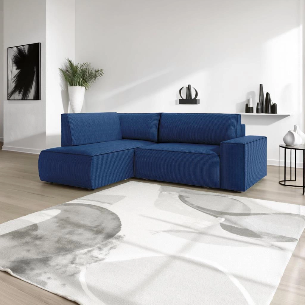 Narożnik z funkcją spania Molde L lewy sztruksowy granatowy marki Intesi to nowoczesny mebel wypoczynkowy do salonu, który łączy wygodę codziennego użytkowania z funkcjonalnością i wyrazistym stylem. Pokryty miękką tkaniną sztruksową w głębokim granatowym odcieniu, oferuje dużą powierzchnię spania 200x135 cm oraz praktyczny pojemnik na pościel. Jego L-kształtna bryła i wyprofilowane podłokietniki sprawiają, że doskonale sprawdzi się zarówno w przestronnych, jak i mniejszych wnętrzach.