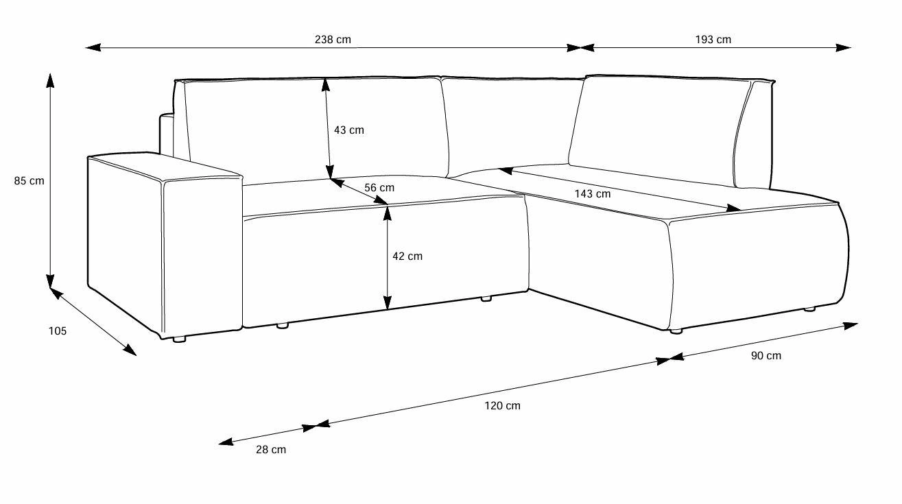 - Rozkładana funkcja spania – łatwo przekształcisz narożnik w wygodne łóżko o powierzchni 200×135 cm, idealne do codziennego użytku lub dla niespodziewanych gości.