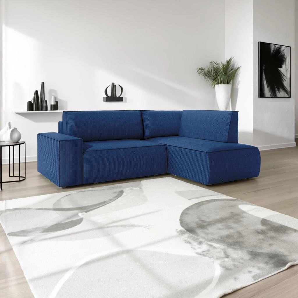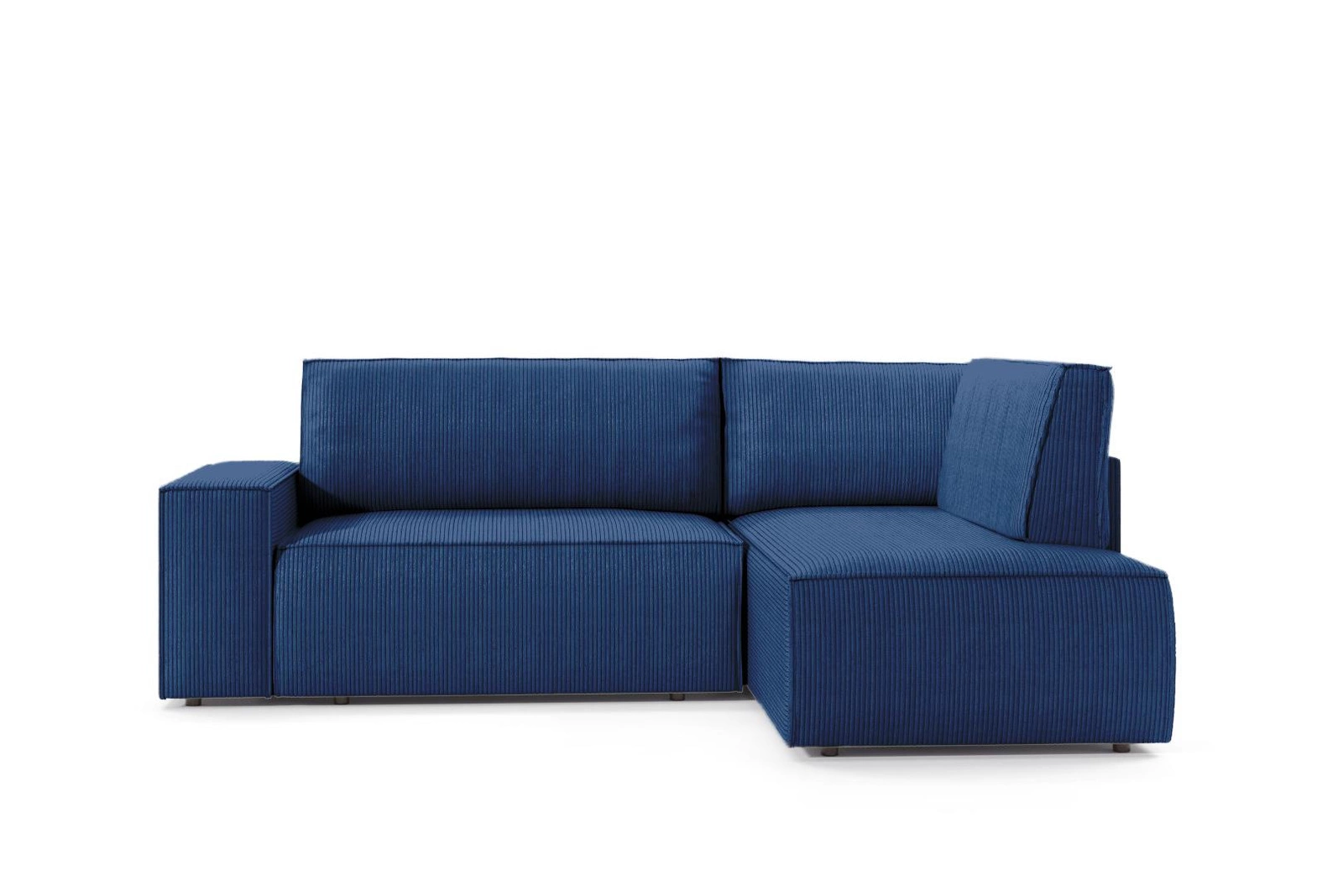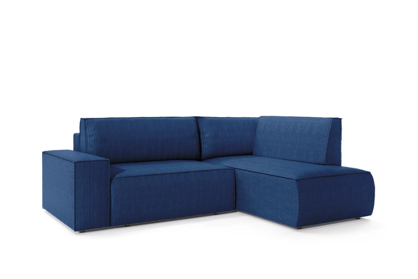 Narożnik z funkcją spania Molde L prawy marki Intesi to połączenie stylu skandynawskiego, wygody i praktycznych rozwiązań. Wykonany z przyjemnej w dotyku, sztruksowej tkaniny w głębokim granatowym kolorze, oferuje komfort zarówno do codziennego wypoczynku, jak i jako kanapa narożna do spania. Duża powierzchnia spania 200x135 cm oraz pojemnik na pościel czynią ten nowoczesny narożnik idealnym wyborem do salonu, gdzie liczy się funkcjonalność bez kompromisów w estetyce.