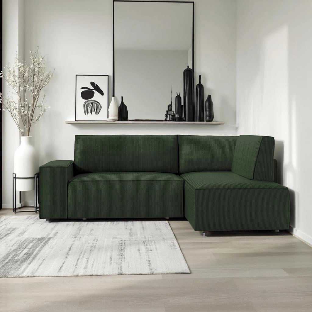 Ten narożnik z funkcją spania został zaprojektowany z myślą o maksymalnej funkcjonalności. Rozkładany mechanizm umożliwia szybkie przekształcenie kanapy narożnej w wygodne łóżko do spania codziennego. Pojemny schowek na pościel pozwala bez trudu przechować koce, poduszki czy inne akcesoria, utrzymując porządek nawet w niewielkim salonie. Podłokietniki oraz ergonomiczna konstrukcja zapewniają komfort podczas rodzinnych seansów filmowych czy spotkań z przyjaciółmi.