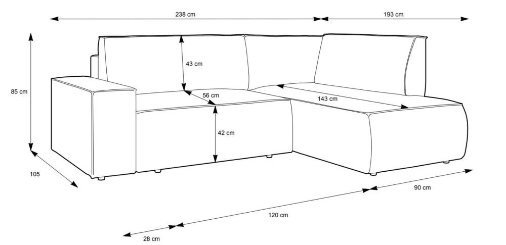 Narożnik Molde L prawy to doskonały wybór do nowoczesnego salonu, w którym liczy się zarówno komfort, jak i estetyka. Dzięki funkcji spania rozłożysz go błyskawicznie, tworząc miejsce do codziennego wypoczynku lub wygodny narożnik do spania dla gości. Szerokie siedzisko i powierzchnia spania 200×135 cm pozwalają na swobodny sen dwóch osób, a dopracowane proporcje (238×195 cm) sprawdzą się zarówno w większych, jak i średnich przestrzeniach dziennych.