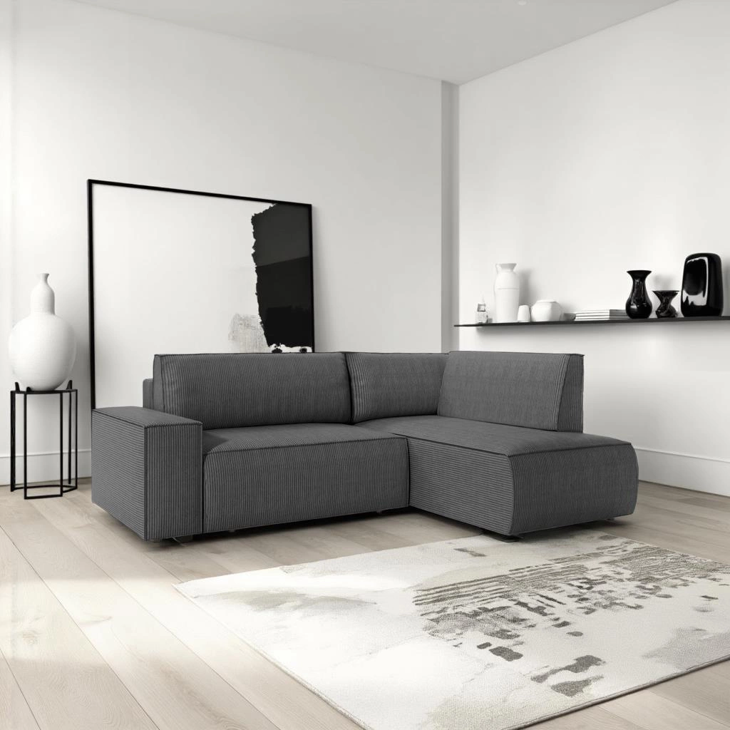 Narożnik z funkcją spania Molde L prawy marki Intesi to nowoczesny mebel wypoczynkowy, który łączy w sobie komfort, praktyczność i unikalny sztruksowy design. Jego szary kolor idealnie wpisuje się w aktualne trendy aranżacji salonów, a przemyślana bryła w kształcie litery L sprawia, że narożnik doskonale sprawdza się zarówno w mniejszych, jak i większych przestrzeniach. Powierzchnia spania 200×135 cm oraz pojemnik na pościel czynią ten narożnik wyjątkowo funkcjonalnym rozwiązaniem do codziennego użytku.
