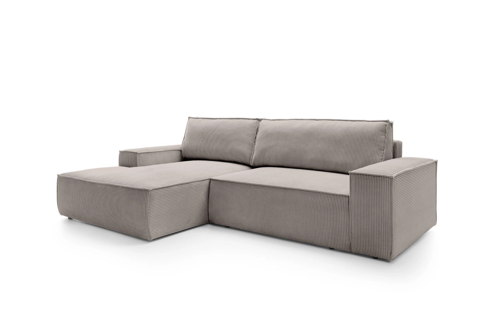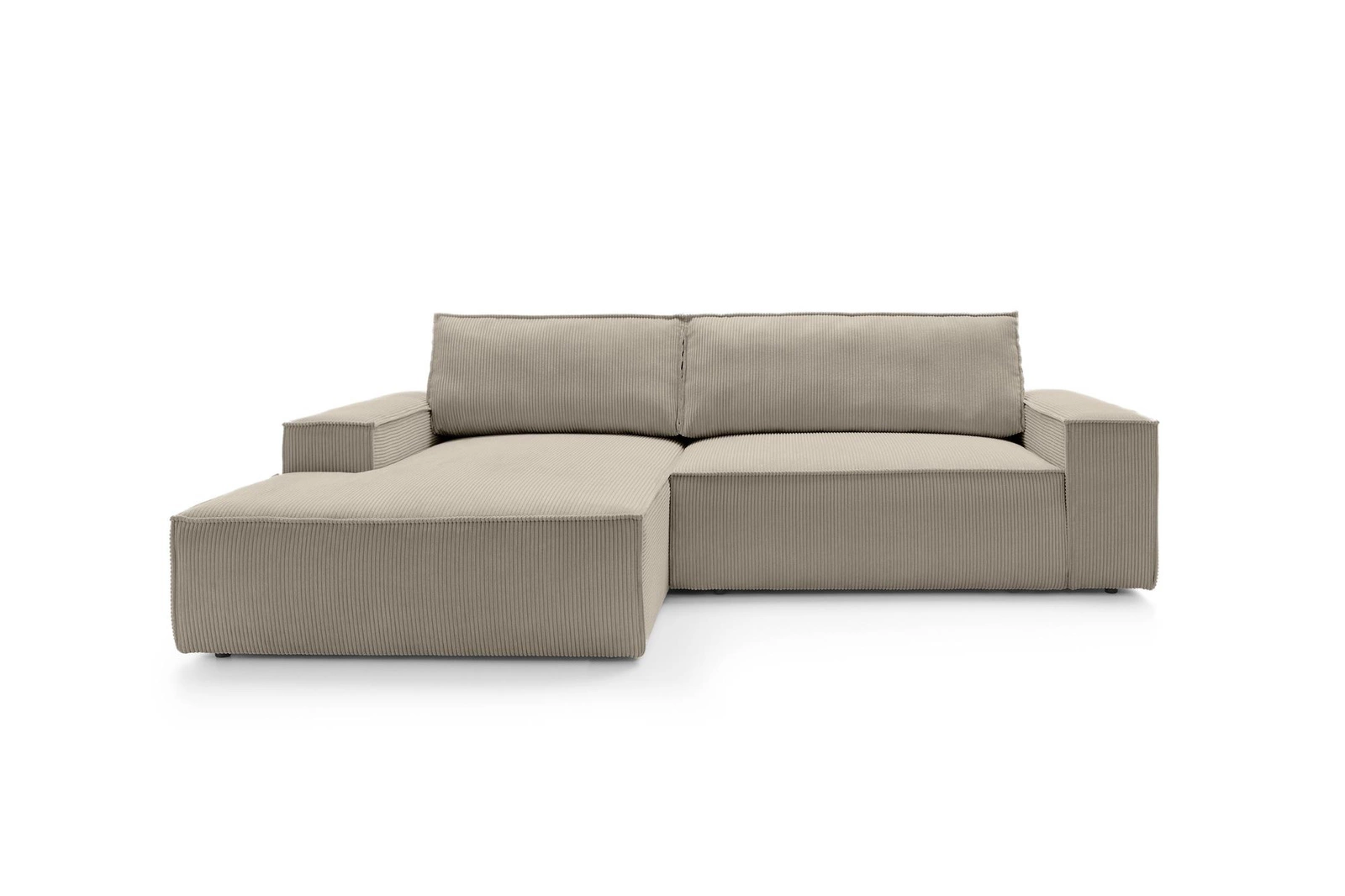 Narożnik z funkcją spania Molde M lewy sztruksowy beżowy marki Intesi to propozycja dla osób ceniących nowoczesny design, komfort codziennego wypoczynku i praktyczne rozwiązania do salonu. Wyróżnia się miękką, sztruksową tapicerką w kolorze cappucino, obszerną powierzchnią spania 200x135 cm oraz dużym pojemnikiem na pościel, pozwalającym na optymalne wykorzystanie przestrzeni. Dzięki przemyślanemu kształtowi litery L oraz wygodnym podłokietnikom, narożnik idealnie wpisuje się we współczesne wnętrza, zapewniając relaks i funkcjonalność każdego dnia.