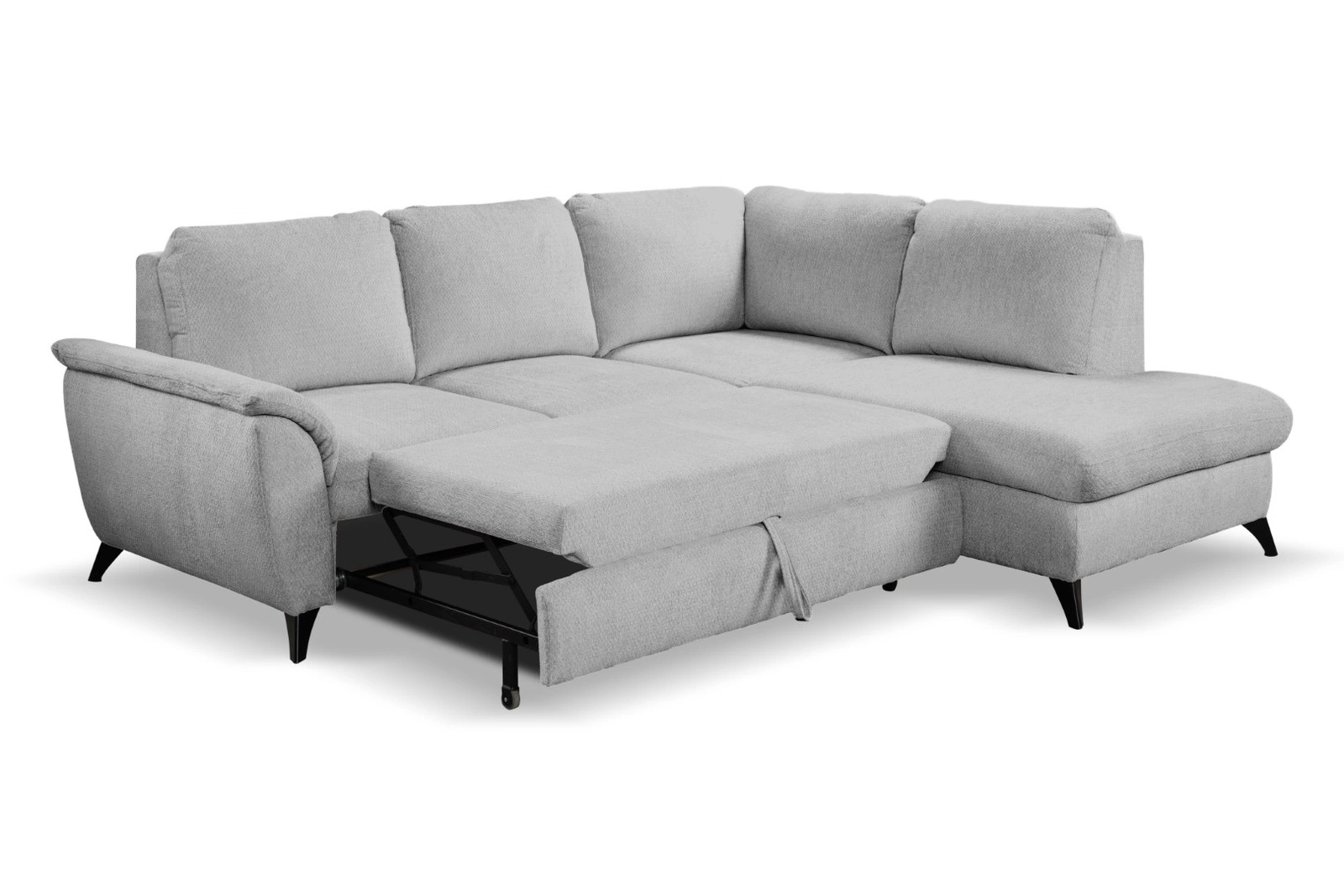 Narożnik Nevada to propozycja dla osób, które szukają funkcjonalnych i estetycznych rozwiązań do nowoczesnych wnętrz. Wyrazista forma, subtelne przeszycia oraz smukłe, czarne nóżki podkreślają jego lekkość i wpisują się w skandynawski minimalizm. Zastosowanie tkaniny o jasnoszarym odcieniu sprawia, że kanapa narożna łatwo dopasuje się do różnych aranżacji, rozświetlając i powiększając optycznie przestrzeń. Narożnik z funkcją spania idealnie łączy codzienny relaks z praktycznością – wystarczy jeden ruch, by zmienić go w wygodne łóżko dla gości.