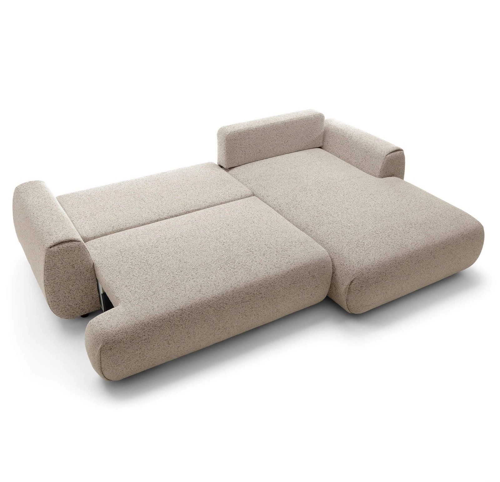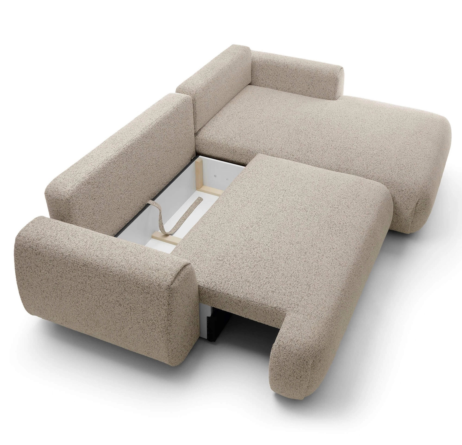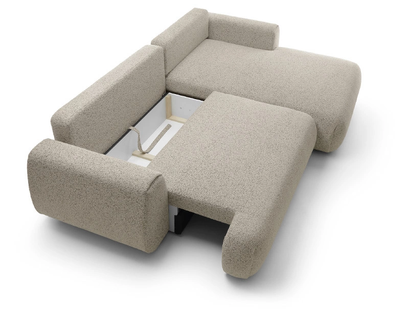 - Funkcja spania i pojemnik na pościel – łatwo zamienisz narożnik w łóżko i przechowasz niezbędne tekstylia w zasięgu ręki