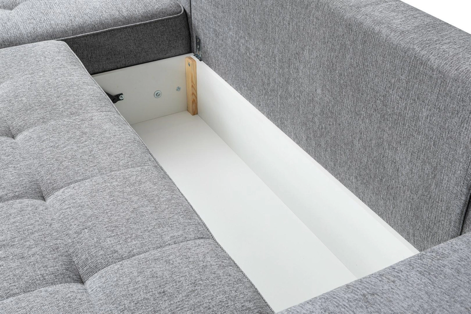 Narożnik rozkładany Rabis z pojemnikiem na pościel to nie tylko stylowy mebel wypoczynkowy, ale przede wszystkim praktyczne rozwiązanie do codziennego użytkowania. Szerokość 266 cm i głębokość 185 cm zapewniają dużo miejsca do relaksu, a mechanizm rozkładania pozwala w kilka chwil zamienić kanapę narożną w wygodne łóżko. Pojemny schowek pod siedziskiem pozwala dyskretnie przechowywać pościel, koce czy poduszki, utrzymując porządek w salonie. Wysokość siedziska 44 cm i ergonomiczne oparcie zapewniają wygodę podczas rodzinnych spotkań i codziennego odpoczynku.