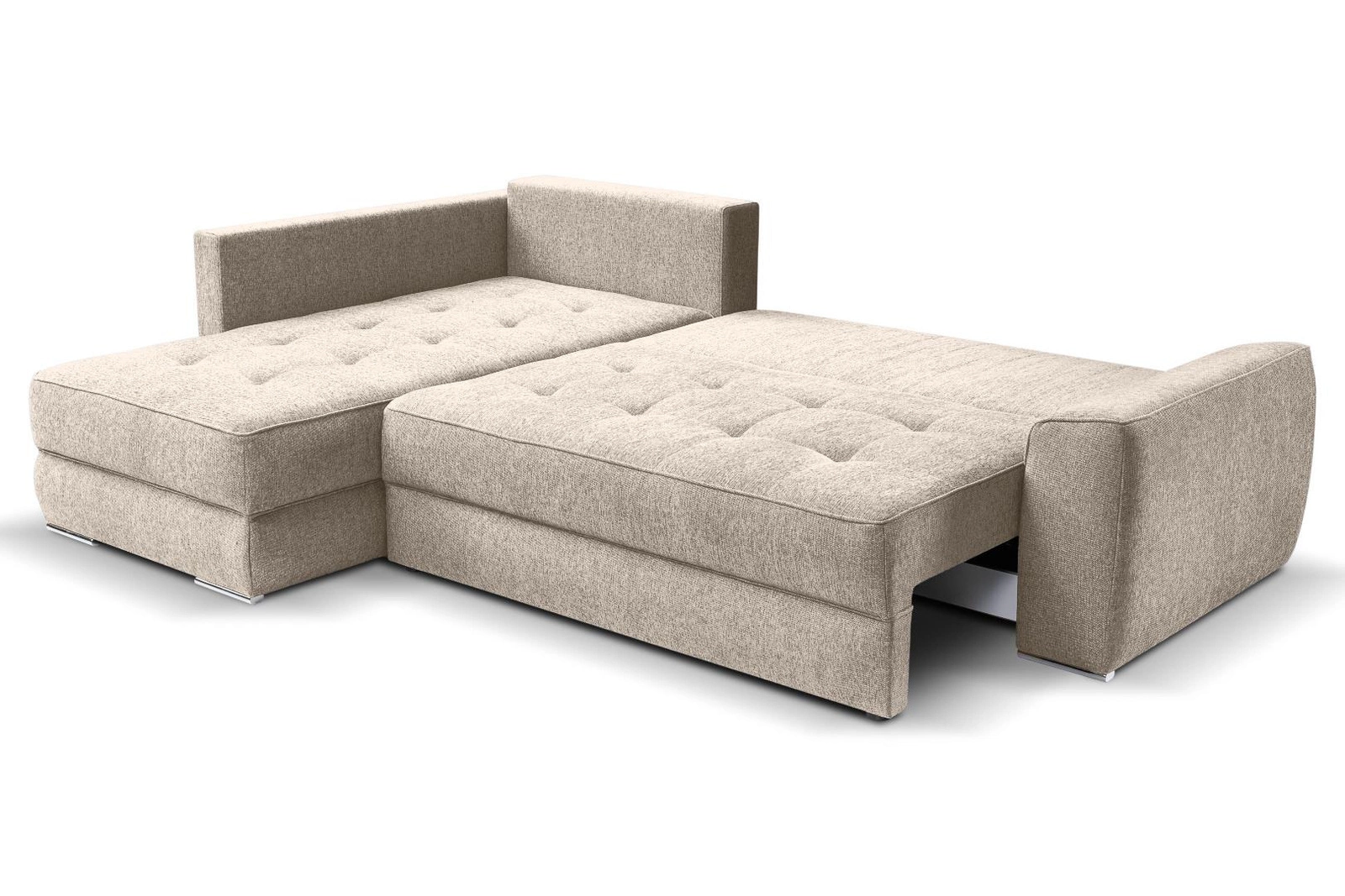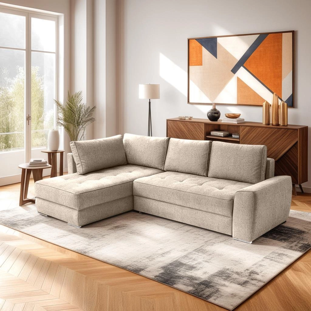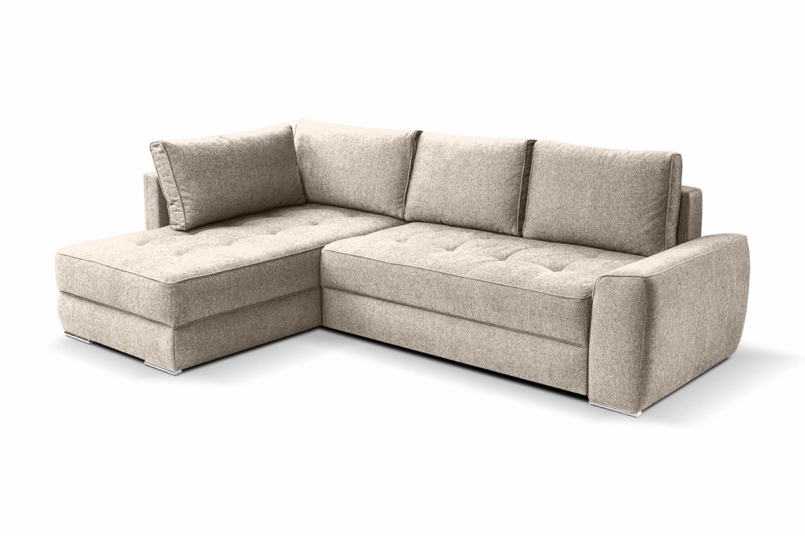 - Nowoczesna stylistyka i beżowa tkanina – łatwo dopasujesz narożnik do swojej aranżacji