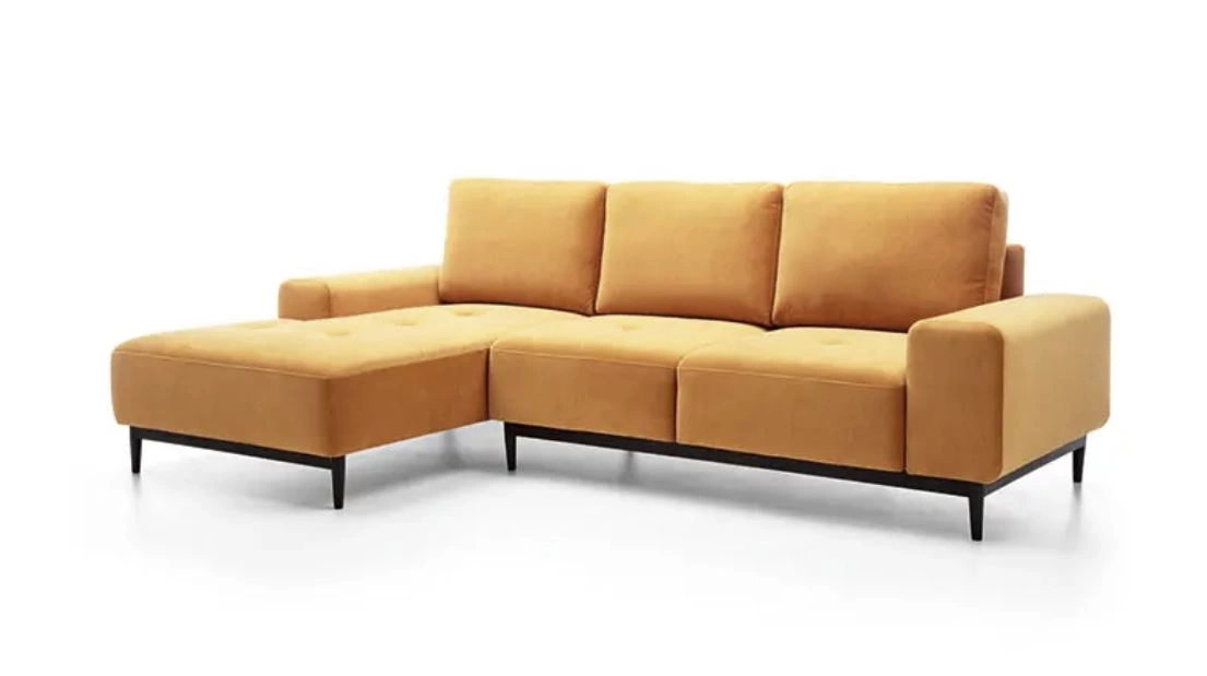 Kanapa narożna Revon przyciąga wzrok wyrazistym żółtym kolorem, który natychmiast ożywia przestrzeń i wprowadza pozytywną energię. Aksamitna tkanina welurowa jest nie tylko przyjemna w dotyku, ale też efektownie rozprasza światło, nadając wnętrzu elegancji. Nowoczesna linia mebla, podkreślona czarnymi nóżkami oraz minimalistycznymi podłokietnikami, świetnie wpisuje się w aktualne trendy aranżacyjne i pozwala łatwo dopasować narożnik do współczesnych, loftowych lub klasycznych salonów.