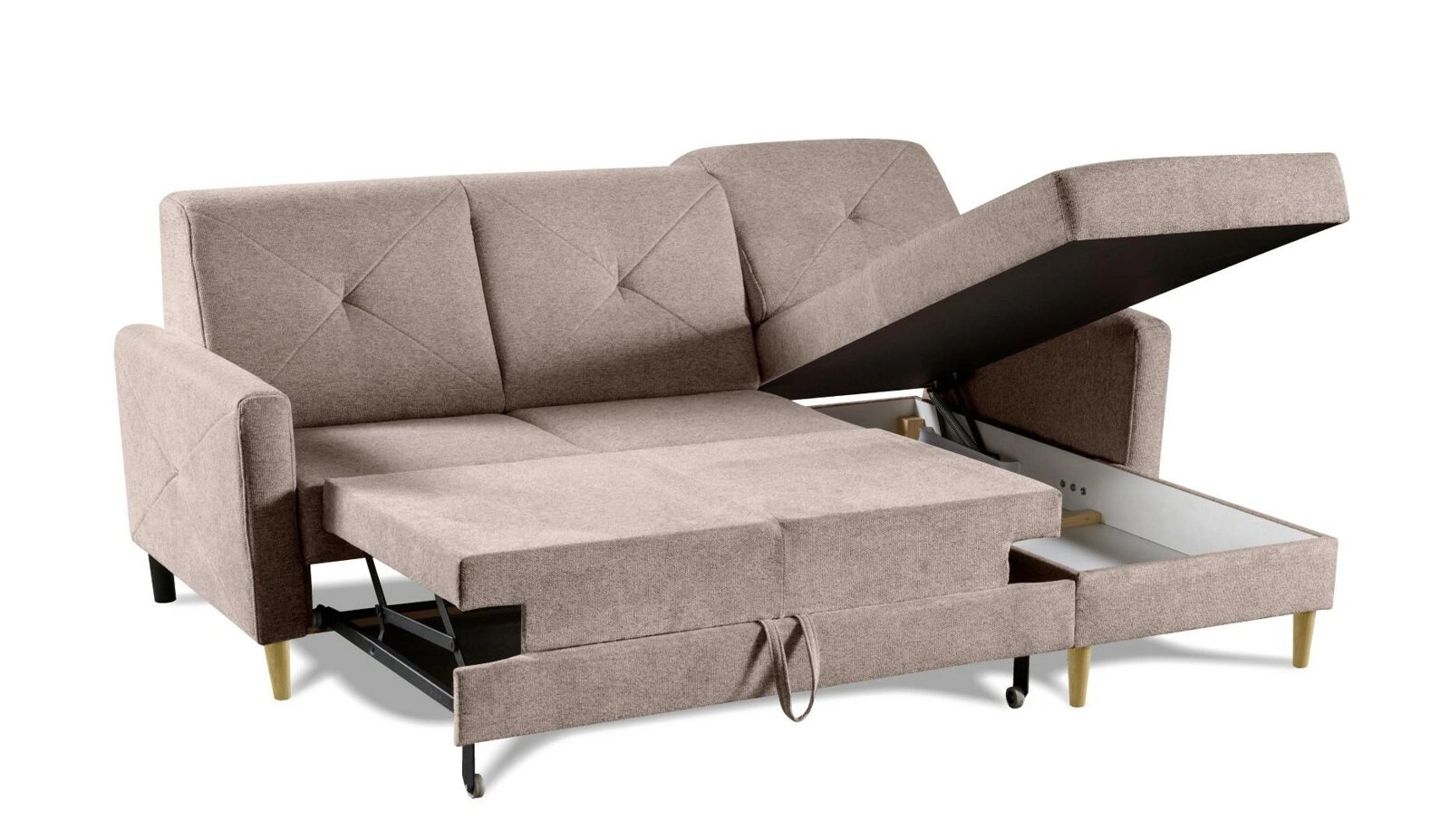 - Łatwy system rozkładania z pojemnikiem na pościel – oszczędność miejsca i szybka zmiana funkcji