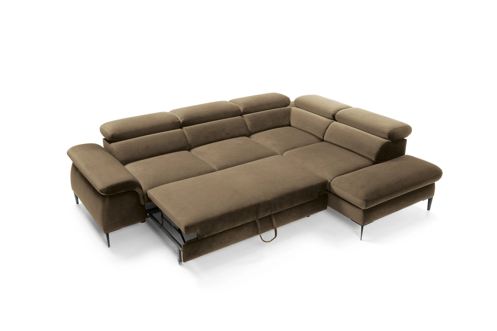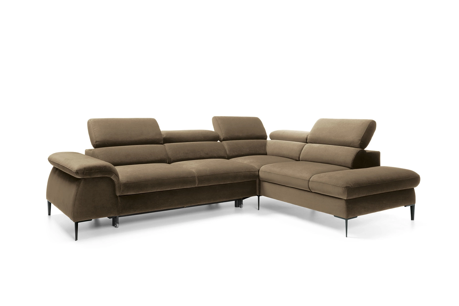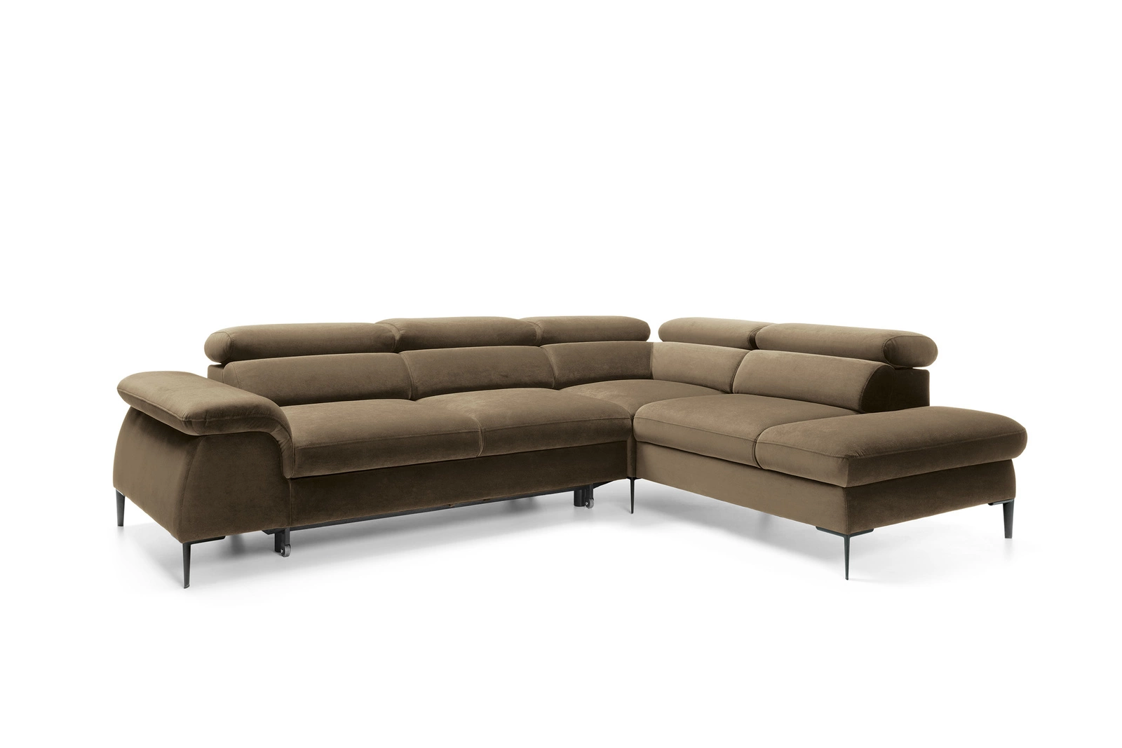 Silvo L to narożnik rozkładany, który idealnie odnajdzie się w przestronnym salonie, oferując nie tylko komfortowe siedzisko, ale i dodatkowe miejsce do spania. Rozkładana powierzchnia pozwala na wygodny sen nawet dwóm osobom, a praktyczny pojemnik ułatwia przechowywanie pościeli i koców. Wysokie, czarne nogi nie tylko podkreślają lekkość bryły, ale także pozwalają na swobodne sprzątanie pod meblem – to duża zaleta dla właścicieli robotów sprzątających i osób ceniących porządek na co dzień.
