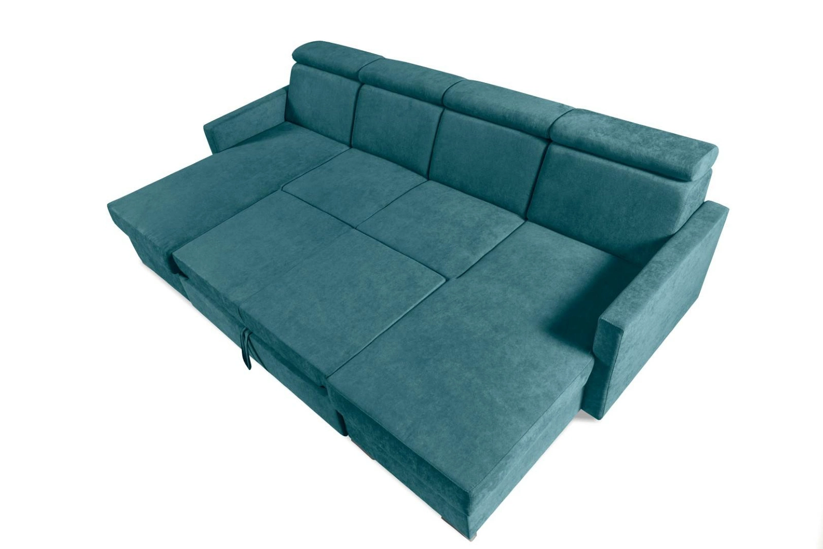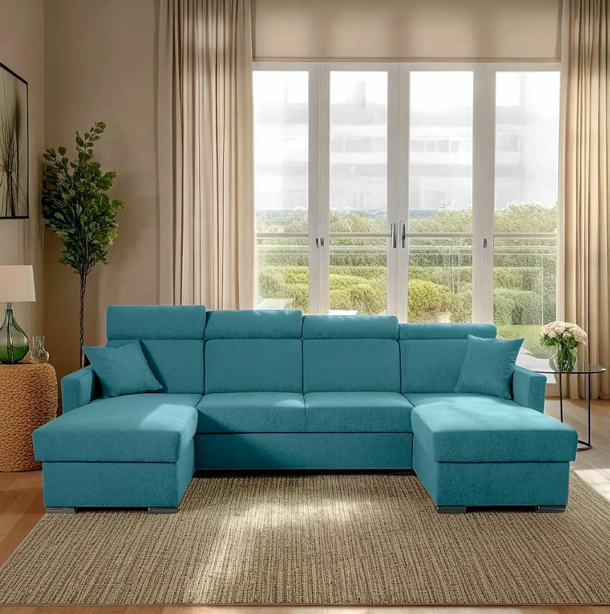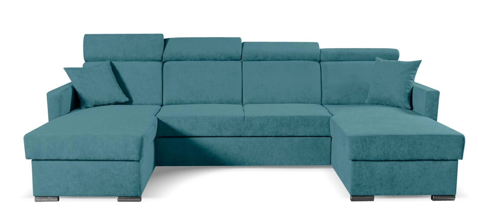 Narożnik z funkcją spania Mils marki Intesi to nowoczesny, U-kształtny mebel wypoczynkowy do salonu, utrzymany w wyrazistym morskim kolorze. Oferuje aż cztery komfortowe miejsca do siedzenia, a po rozłożeniu zapewnia dużą powierzchnię spania 120×250 cm. Wykończenie z aksamitnej tkaniny Soro w połączeniu z eleganckimi chromowanymi nóżkami nadaje narożnikowi świeży, stylowy charakter i sprawia, że jest idealnym wyborem do nowoczesnych wnętrz.