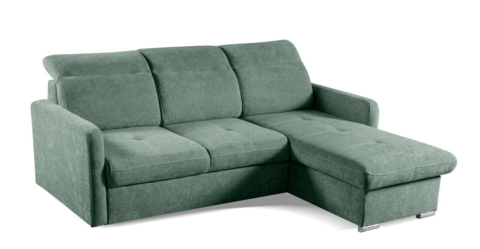 Nowoczesny narożnik Limi lewy marki Intesi to stylowy i wygodny mebel wypoczynkowy do salonu, który łączy w sobie funkcję codziennego relaksu i praktyczne rozwiązania. Tapicerowany zieloną, aksamitną tkaniną, wyposażony w funkcję spania o powierzchni 120×195 cm oraz pojemny schowek na pościel, doskonale sprawdzi się zarówno w przestronnych, jak i mniejszych wnętrzach. Jego kompaktowe wymiary 215×167 cm oraz lekkość formy wsparta eleganckimi, srebrnymi nóżkami, czynią z niego atrakcyjną propozycję dla osób ceniących nowoczesny design i codzienną funkcjonalność.
