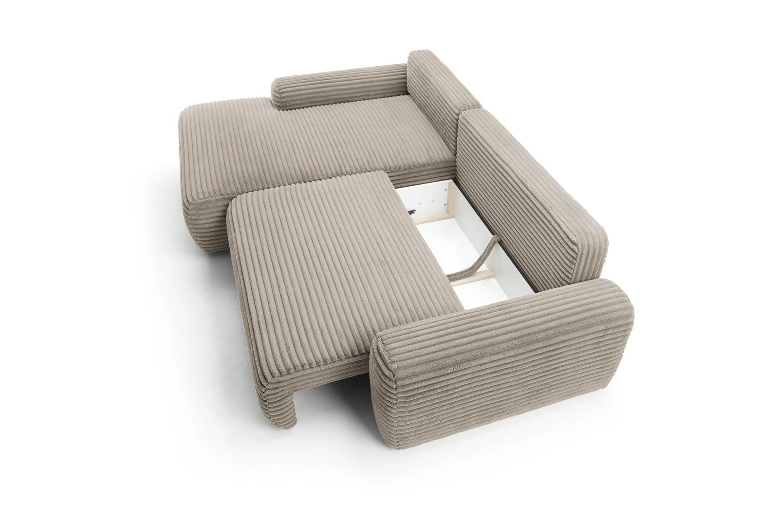 - Rozkładana kanapa narożna z pojemnikiem – łatwo przekształcisz ją w wygodne łóżko i uporządkujesz akcesoria do spania.