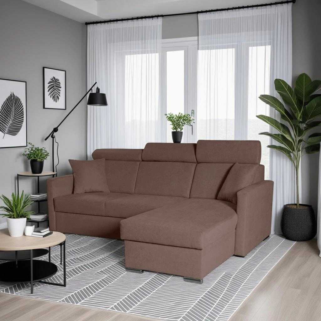 Narożnik rozkładany Mils brązowy to połączenie wygody, nowoczesnej estetyki i praktycznych funkcji, które doceni każdy, kto ceni porządek i komfort w codziennym życiu. Postaw na stylowy narożnik z funkcją spania do salonu i przekonaj się, jak wiele może zmienić w Twoim domu.