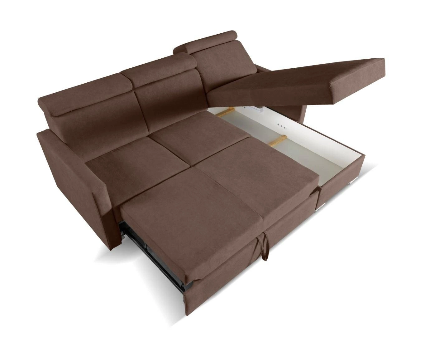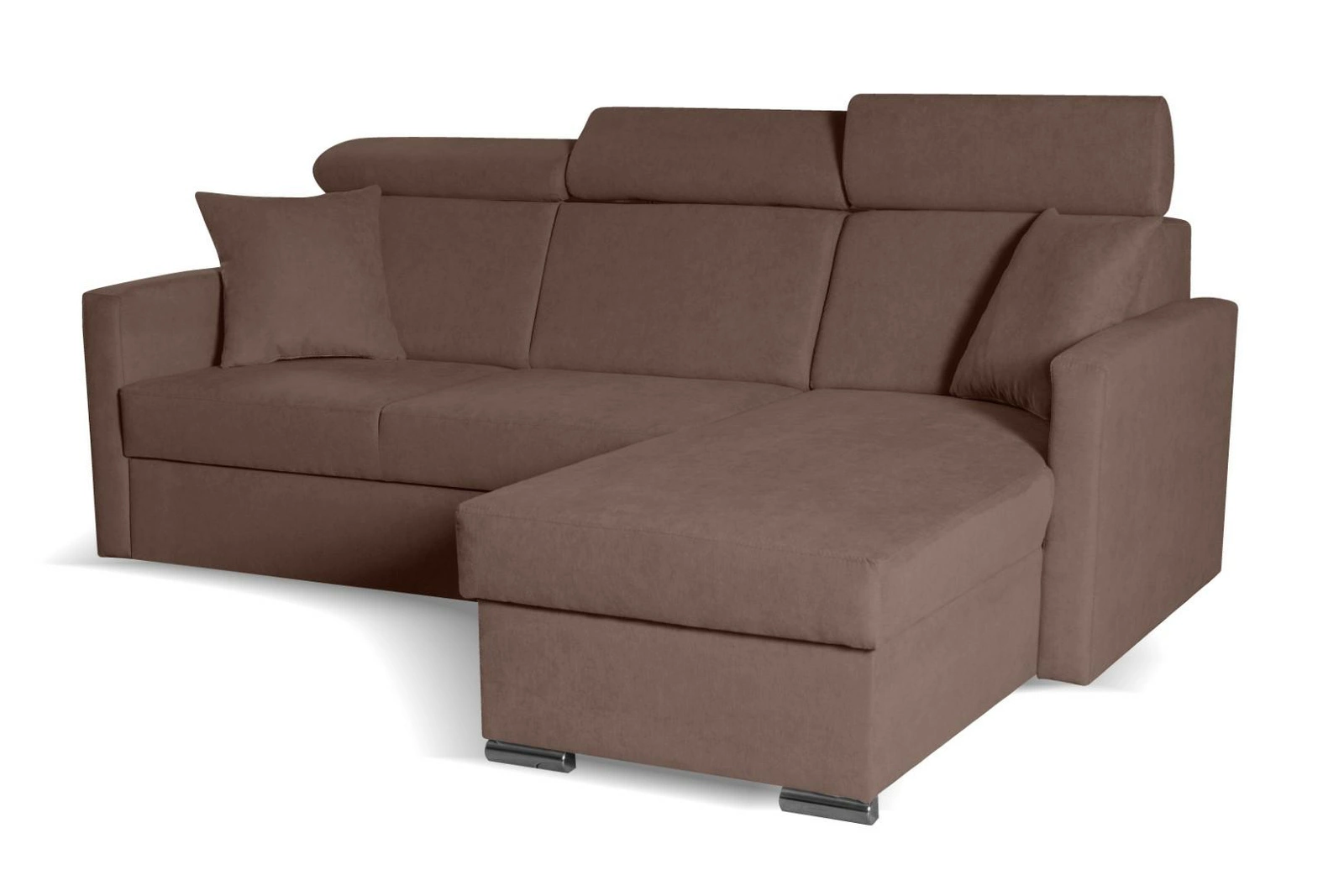 Nowoczesny narożnik z funkcją spania i pojemnikiem Mils brązowy marki Intesi to propozycja dla osób, które szukają praktycznego i stylowego rozwiązania do salonu. Wykończony miękką, aksamitną tkaniną Soro w głębokim odcieniu brązu, oferuje komfortowe siedzisko z wypełnieniem ze sprężyn falistych i pianki tapicerskiej. Model rozkładany, wyposażony w pojemny schowek na pościel, łatwo dopasujesz do swoich potrzeb – dostępny jest zarówno w wersji lewostronnej, jak i prawostronnej.