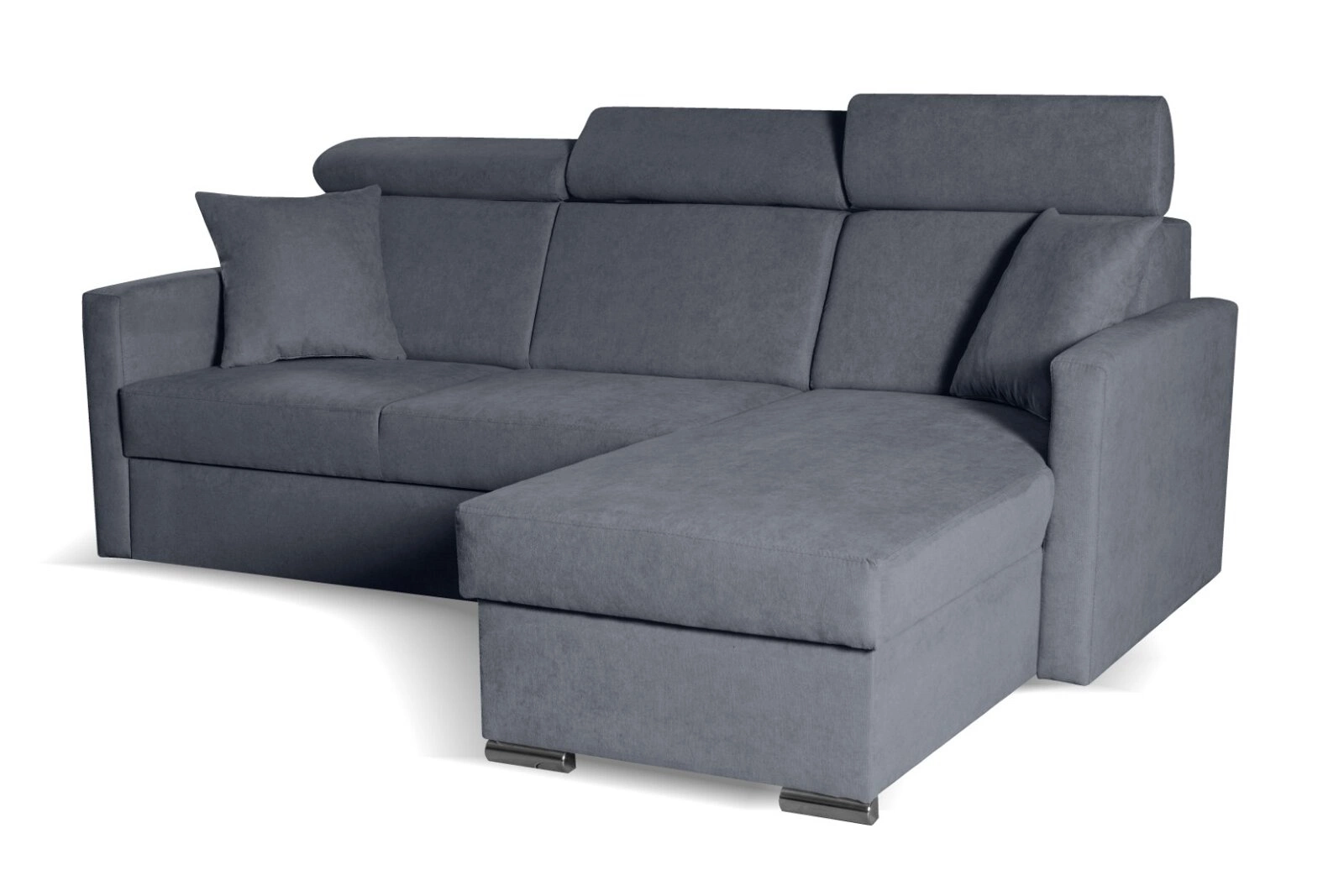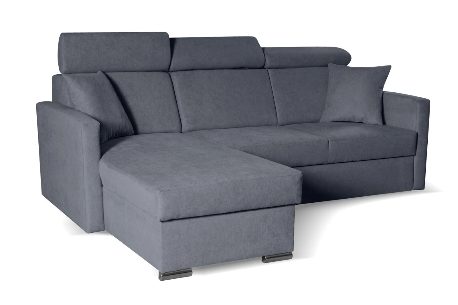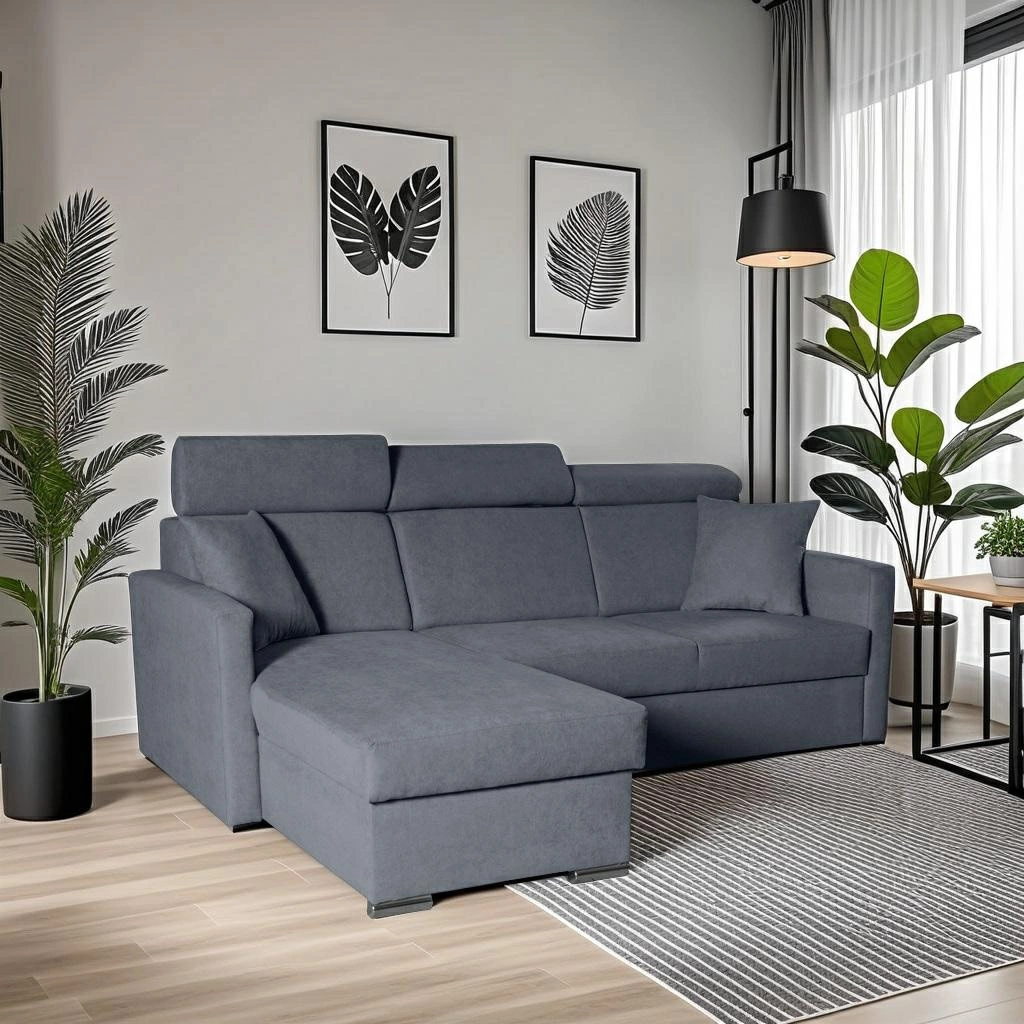 Nowoczesny narożnik z funkcją spania i pojemnikiem Mils marki Intesi to połączenie elegancji i praktyczności, stworzone z myślą o wygodzie codziennego wypoczynku w salonie. Tapicerowany miękką, aksamitną tkaniną w odcieniach szarości i granatu, narożnik oferuje komfortowe miejsce dla trzech osób, a dzięki funkcji rozkładania zyskujesz dodatkową powierzchnię do spania o wymiarach 120×195 cm. Zintegrowany pojemnik na pościel oraz możliwość wyboru ustawienia – prawostronny lub lewostronny – sprawiają, że jest to rozwiązanie maksymalnie dopasowane do Twoich potrzeb.