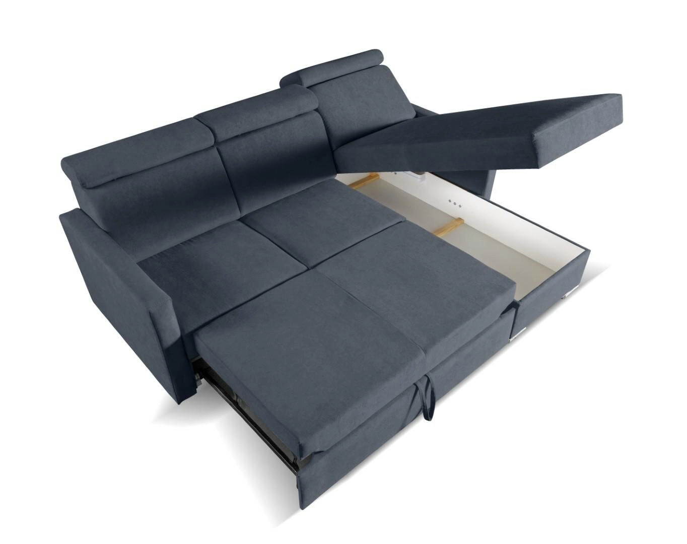 Docenisz funkcjonalność narożnika Mils w codziennym użytkowaniu. Przemyślany pojemnik na pościel pozwoli uporządkować zapasowe koce czy poduszki, a prosty mechanizm rozkładania sprawia, że przygotowanie miejsca do snu zajmuje zaledwie chwilę. Uniwersalność konstrukcji umożliwia montaż zarówno w ustawieniu prawym, jak i lewym, dzięki czemu narożnik łatwo dopasujesz do rozkładu swojego salonu lub pokoju młodzieżowego.