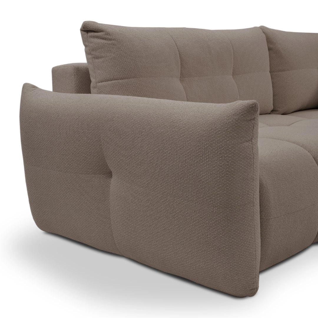 Ten lewy narożnik do salonu wyróżnia się nowoczesnym stylem, który harmonijnie wpisuje się w aranżacje minimalistyczne, skandynawskie czy klasyczne. Odcień cappucino dodaje wnętrzu przytulności i elegancji, a ozdobne pikowania oraz szerokie podłokietniki podkreślają unikalny charakter mebla. Narożnik świetnie sprawdzi się zarówno w dużych, jak i średnich salonach, pozwalając zaaranżować funkcjonalną strefę wypoczynkową.