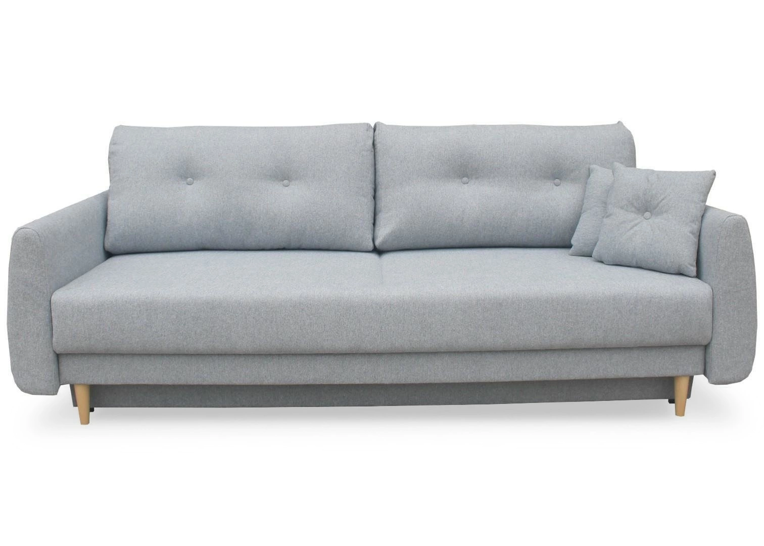 Składa się z tapicerowanego siedziska z podłokietnikami, które wypełnia pianka T30 charakteryzująca się dużym stopniem gęstości. Uzupełniona dodatkowo sprężynami falistymi zapewnia bardzo dobrą sprężystość i doskonałą twardość, która zapobiega odkształcaniu się powierzchni. Całość spoczywa na podstawie z pięciu drewnianych nóg w naturalnym bukowym kolorze oraz dwóch dodatkowych, które wspierają rozkładaną część sofy. Dla jeszcze większego komfortu sofa rozkładana posiada dodatkowe poduszki na oparciu oraz dwie mniejsze ozdobne w kolorze obicia.