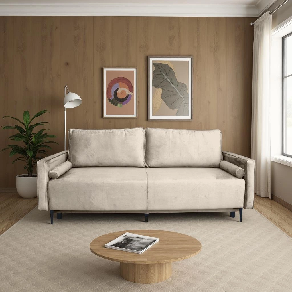 Sofa rozkładana 3 osobowa Arosa marki Intesi to połączenie nowoczesnego designu, funkcjonalności i wygody w jednym meblu. Tapicerowana beżową tkaniną Castel 03, opiera się na lekkiej konstrukcji z czarnymi metalowymi nóżkami i wyposażona jest w pojemny schowek na pościel. Z szerokością 212 cm i głębokością 99 cm, oferuje komfortowe miejsce do siedzenia, a po rozłożeniu zamienia się w praktyczną kanapę z funkcją spania o powierzchni 142x190 cm.