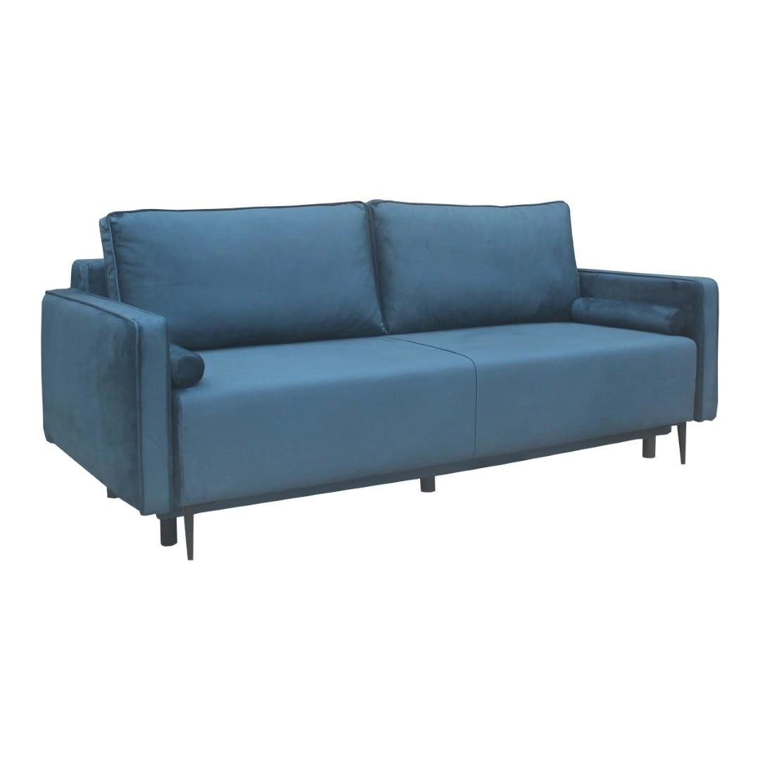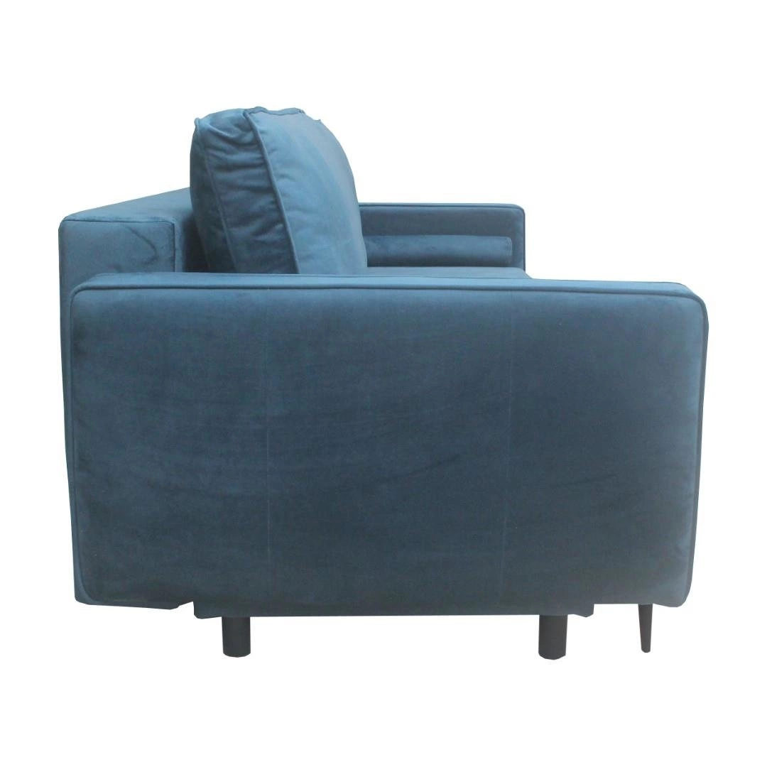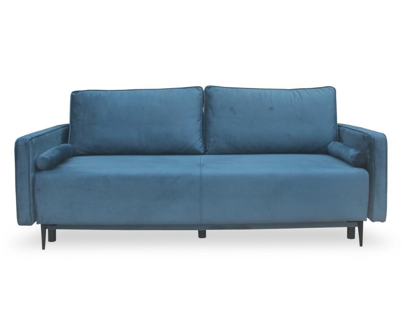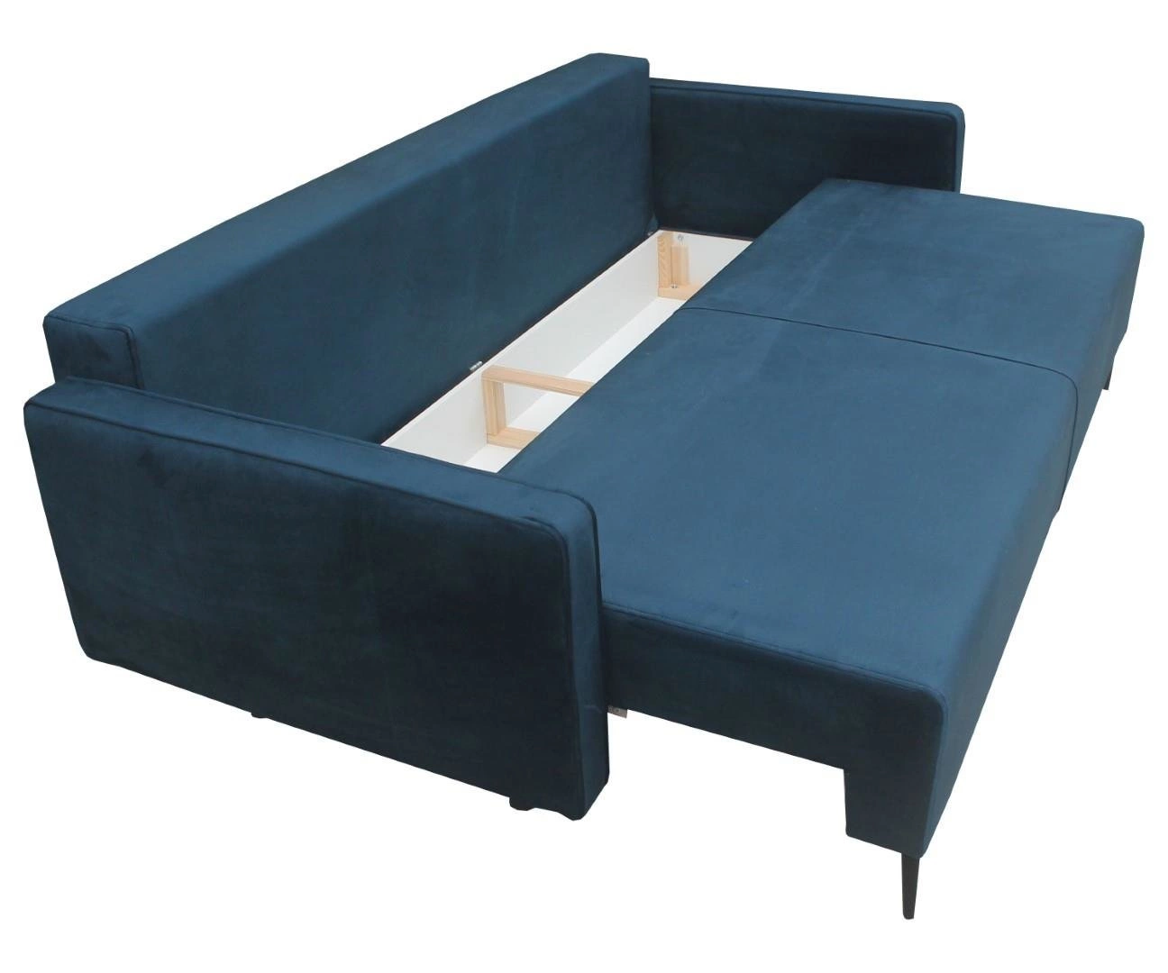 Składa się z tapicerowanego siedziska z podłokietnikami, które wypełnia pianka T30 charakteryzująca się dużym stopniem gęstości. Uzupełniona dodatkowo sprężynami falistymi zapewnia bardzo dobrą sprężystość i doskonałą twardość, która zapobiega odkształcaniu się powierzchni. Całość spoczywa na czarnej podstawie z pięciu drewnianych nóg oraz dwóch dodatkowych z metalu, które wspierają rozkładaną część sofy. Aby zapewnić jeszcze większą wygodę, sofa rozkładana posiada dwie dodatkowe poduszki na oparciu oraz ozdobne wałki. Welwetowa tkanina w trzech dostępnych kolorach jest przyjemna w dotyku, trwała, a przy tym zapewnia doskonałe efekty wizualne. Zaokrąglone krawędzie usztywnione zostały dekoracyjną kedrą, która zapobiega odkształcaniu się miejsc brzegowych i zabezpiecza przez rozpruwaniem.